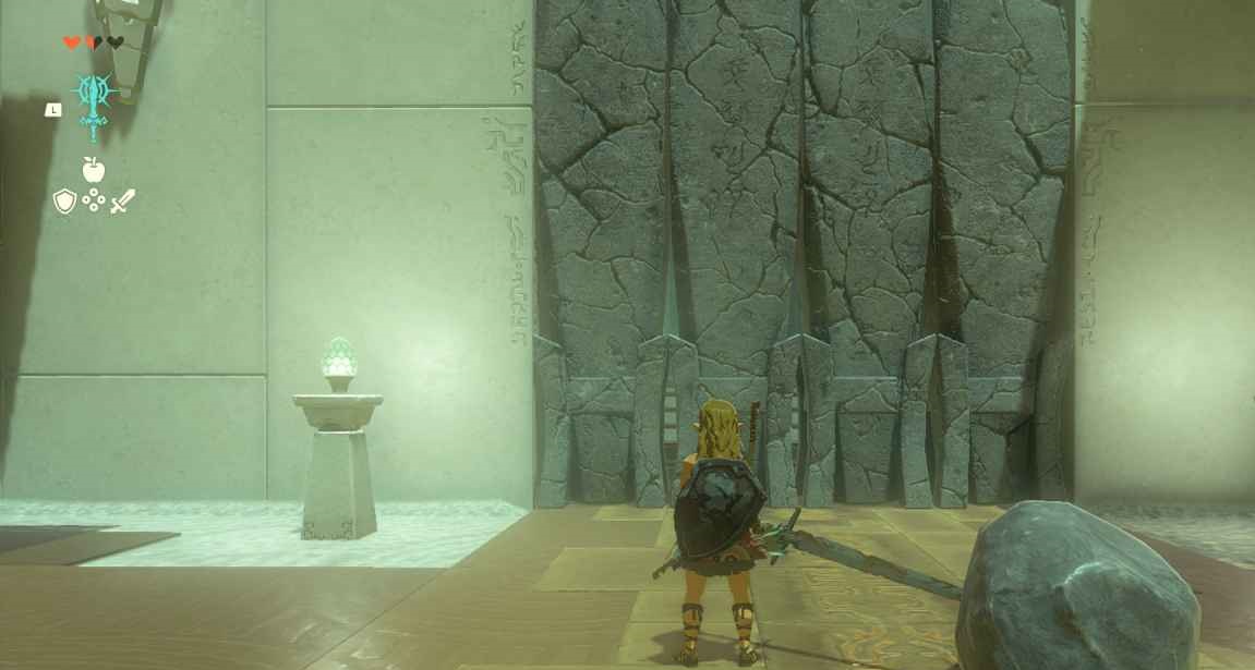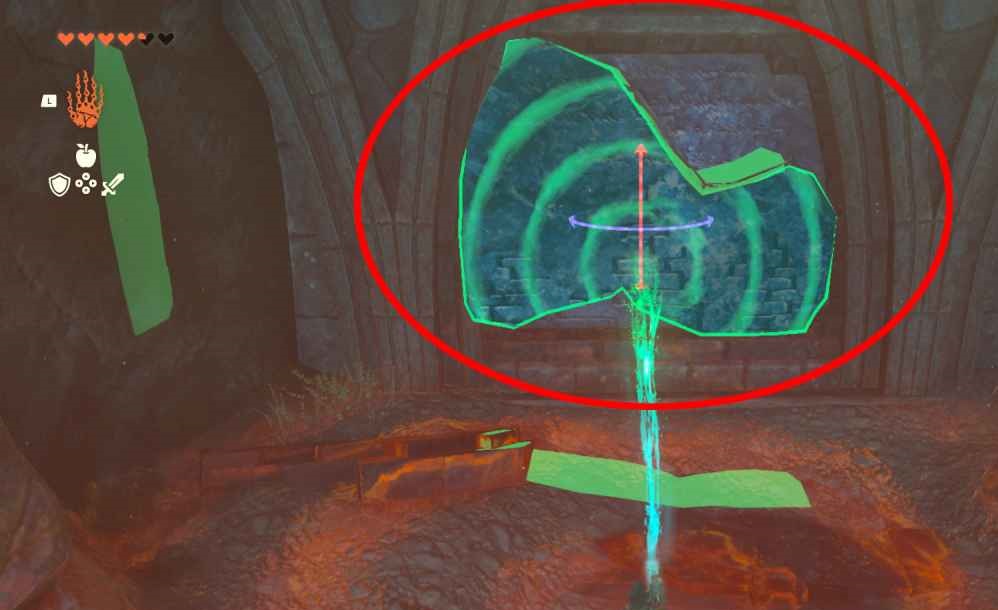 Используйте руку на деревянном сундуке слева, чтобы получить меч. Используйте второй полученный навык, чтобы соединить меч с камнем на земле и получить молот. Примените его для атаки валунов, расположенных в правом углу пещеры. Их разрушение поднимет уровень воды. Можете плыть на этаж выше, чтобы добраться до древних гидротехнических сооружений Зора. Здесь нужно снова разрушить валуны, чтобы поднять уровень воды. С левой стороны используйте руку, чтобы поместить деревянную доску в воду перед валунами. Поднимитесь на доску, чтобы ее атаковать и разрушить валуны. Будьте осторожны и не заденьте саму деревянную доску, иначе она будет разрушена.