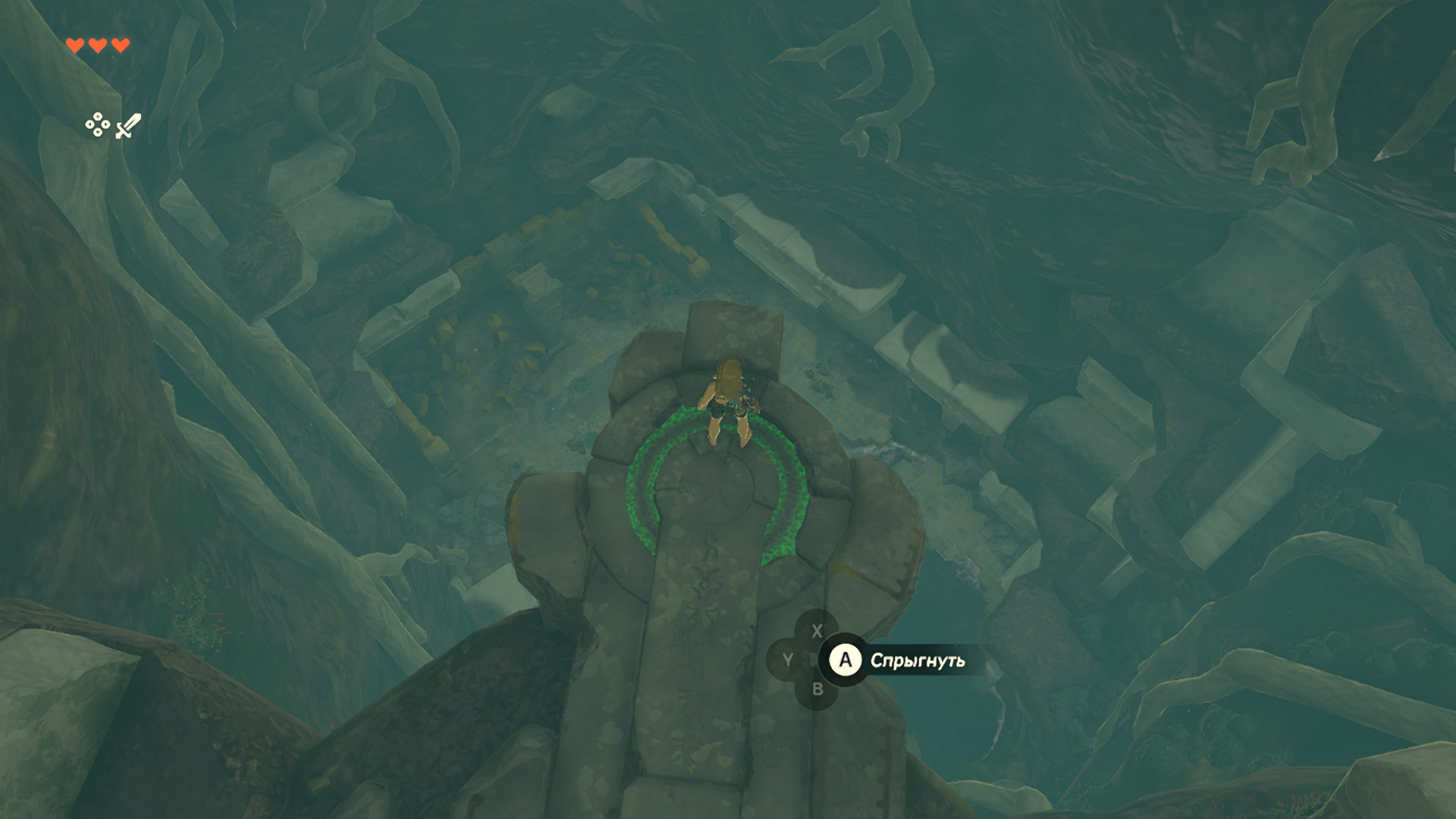 Пройдите вперед и осмотрите застрявший в зарослях поврежденный Высший Меч. Разрубите с его помощью кусты впереди, с этого момента вам будет доступен инвентарь. Взаимодействуйте с устройством впереди. Следуйте через открывшийся проход, трижды спрыгните в воду и откройте первый сундук со старыми сандалиями. Обязательно их наденьте в инвентаре. Выберитесь наружу и спрыгните вниз.