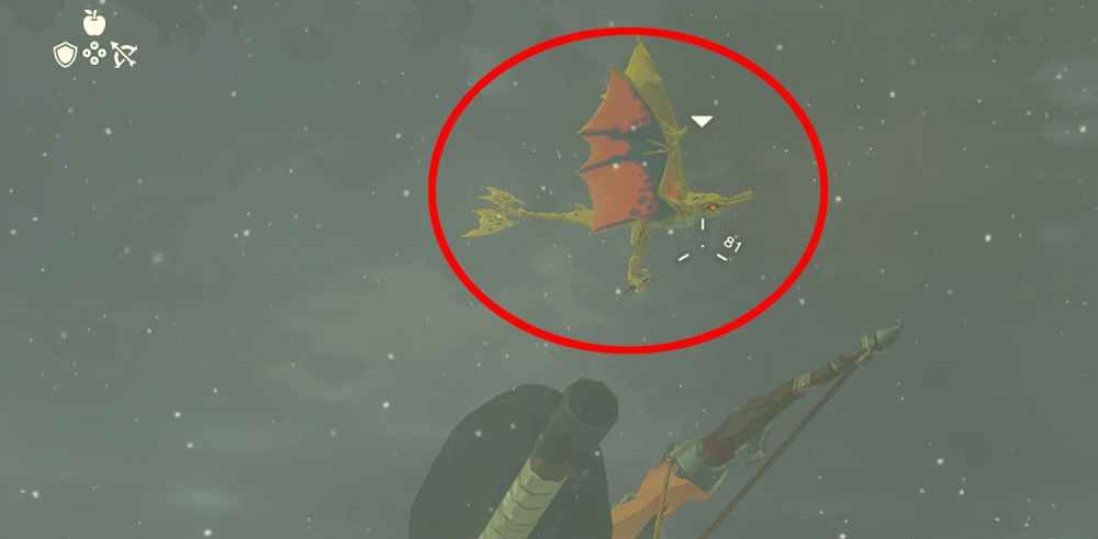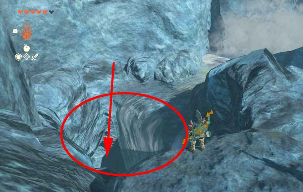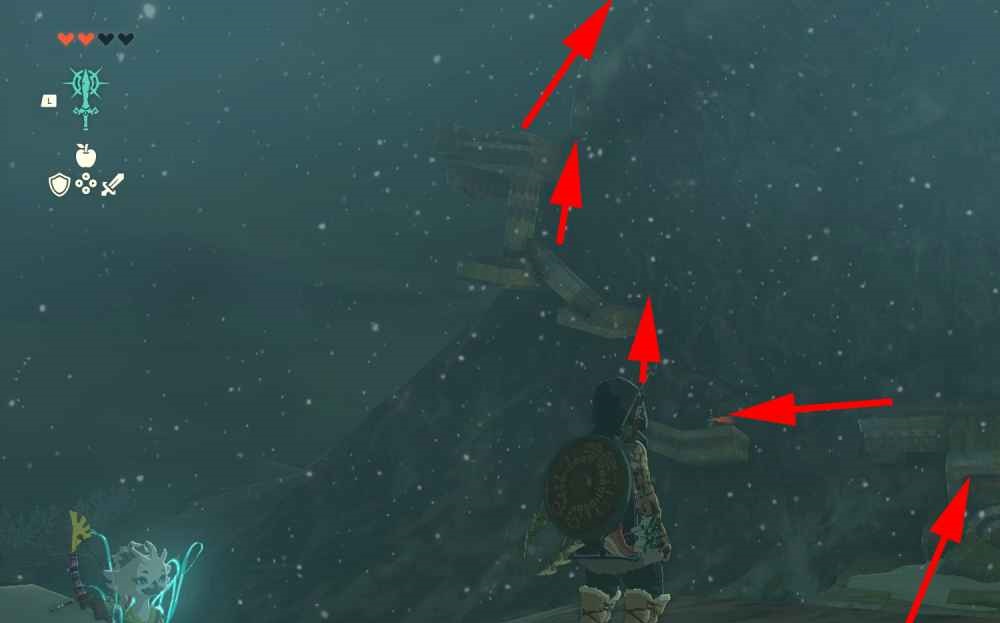 Шаг 2. После того как катапультируетесь на небоскреб, летите на север над большим ущельем. Приземлитесь на другой стороне (на севере) в заснеженную область. Лучший способ — использовать параплан, пока выносливость не достигнет 25%, затем перейти в свободное падение и лететь вперед к заснеженной области. Повторно раскройте параплан, чтобы использовать последние 25 % выносливости на безопасное приземление. Это долгий полет, но все вполне выполнимо. Если не сделаете это, можете быстро телепортироваться к башне и повторить попытку. Обратите внимание, что в этой области очень холодно, поэтому заранее наденьте доспехи с защитой от холода, принести приготовленный перец или источники огня (кремень, дерево, факелы).