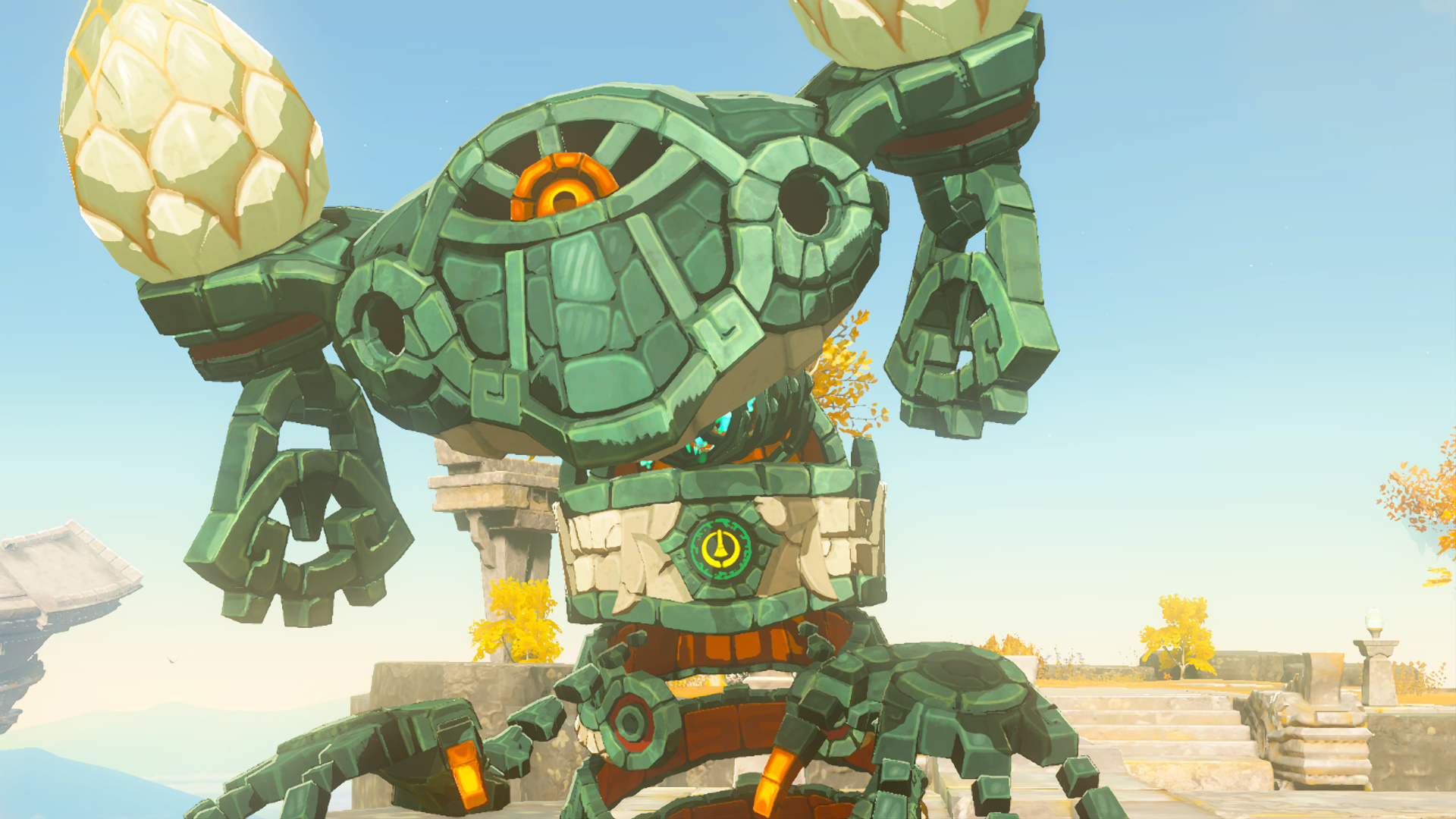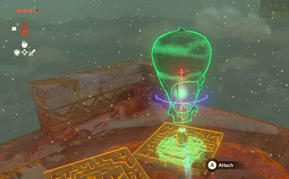 Следуйте по линейному пути по цепи восходящих островов, пока не доберетесь до летающей лодки. Прыгайте на ее крышу, и она подбросит вас высоко в воздух. Используйте параплан, чтобы лететь к святилищу. Активируйте святилище Маяумекис, чтобы создать точку быстрого перемещения. Перелетите к следующей группе островов позади святилища. Приземлитесь в левом крайнем углу, на платформу под большой колонной, на которой есть лед. Используйте способность вознесения, чтобы подняться на столб. Под ним есть сосульки, поэтому встаньте так, чтобы их не было.