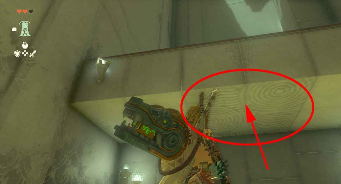 Поднимитесь наверх в Храме Времени и взаимодействуйте с золотым светящимся объектом. После кат-сцены Линк получит новую способность, которая позволяет обратить вспять движение объекта, пока он не вернется туда, где был изначально. Вы можете остановить обратное движение в любой момент. По сути, это манипуляции со временем. В храме, позади того места, где коснулись золотого предмета, есть два водяных колеса. Прыгните на вращающуюся платформу сбоку от водяного колеса и используйте новое умение, чтобы повернуть водяное колесо. Когда оно достигнет вершины, поднимитесь на балкон. Подойдите близко к стене, чтобы протиснуться через столб.