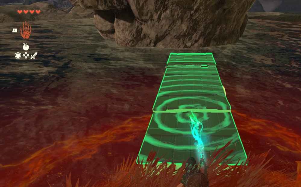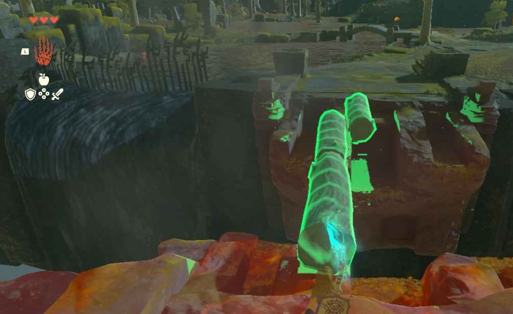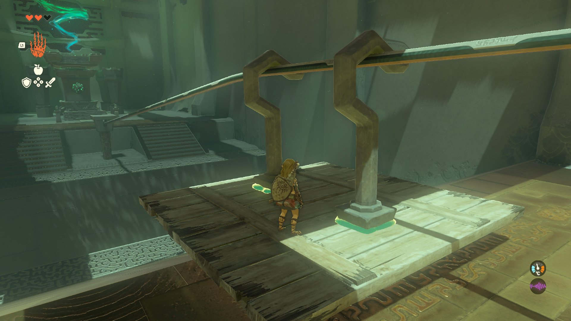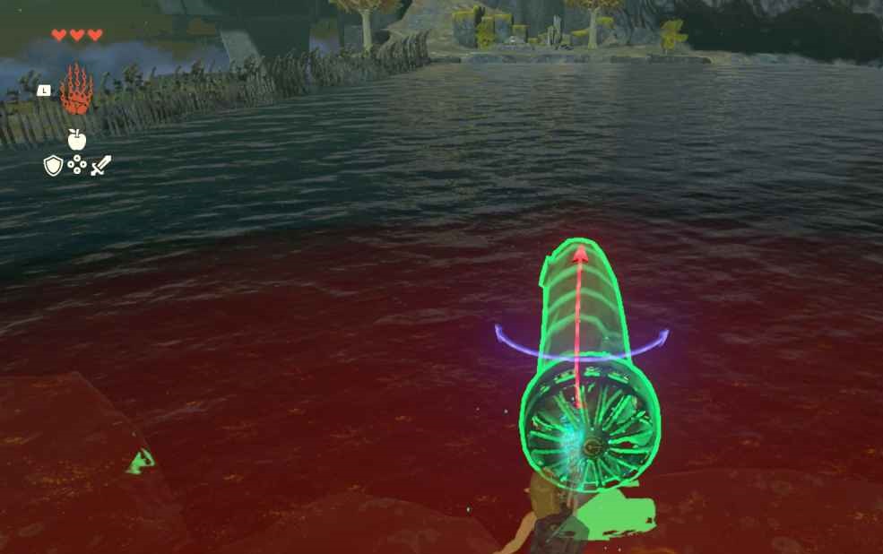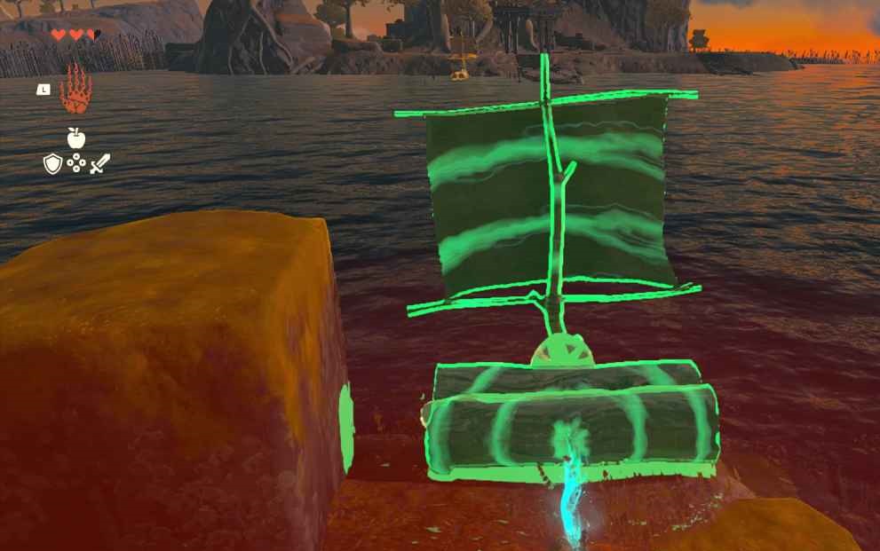 Выйдя из пещеры, вы найдете Рауру и других конструктов, объясняющих, как работают устройства Зонаи. На полу разбросана кучка зеленых турбин и бревен. С помощью руки прикрепите один из зеленых вееров Зонай к концу бревна. Затем поместите бревно в воду, заберитесь на него и ударьте по винту атакой ближнего боя. Так вы создадите «лодку» с вентилятором, и сможете переместиться через озеро.