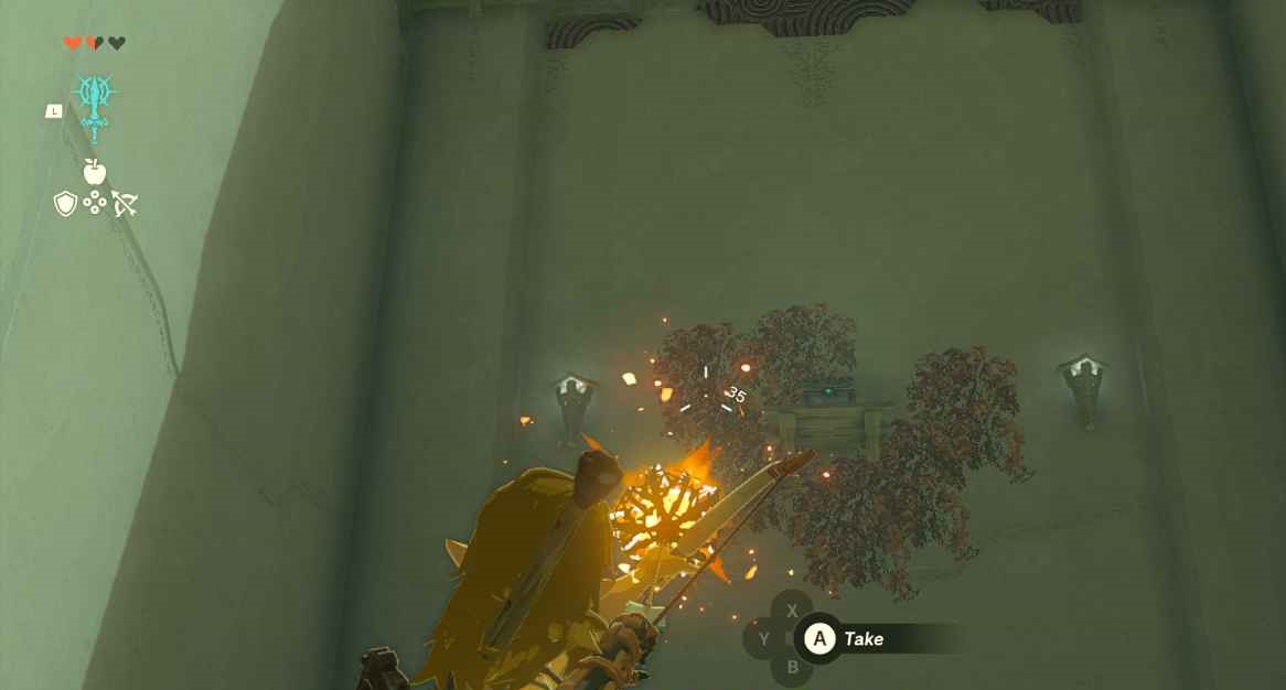 В следующем разделе поверните направо и возьмите лук и огненные плоды с дерева. Объедините фрукт со стрелой, чтобы сделать Горящую стрелу. Выстрелите в лианы на стене, где находится платформа с сундуком. Откройте его и возьмите маленький ключ. Примените его на дверь главного пути. Можете разрушить левую колонну перед дверью молотом, чтобы отыскать бонусный сундук.