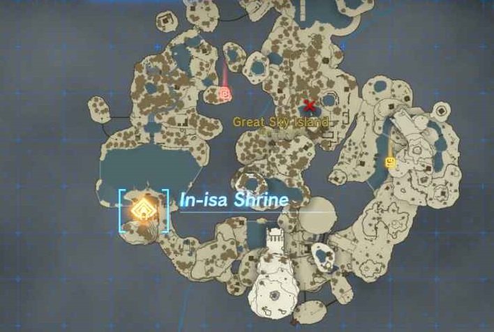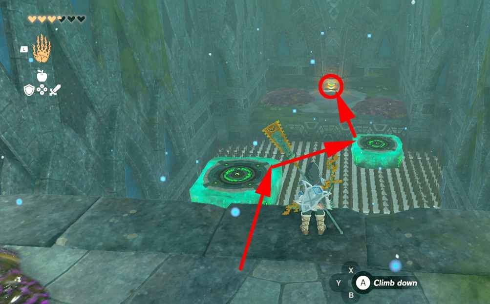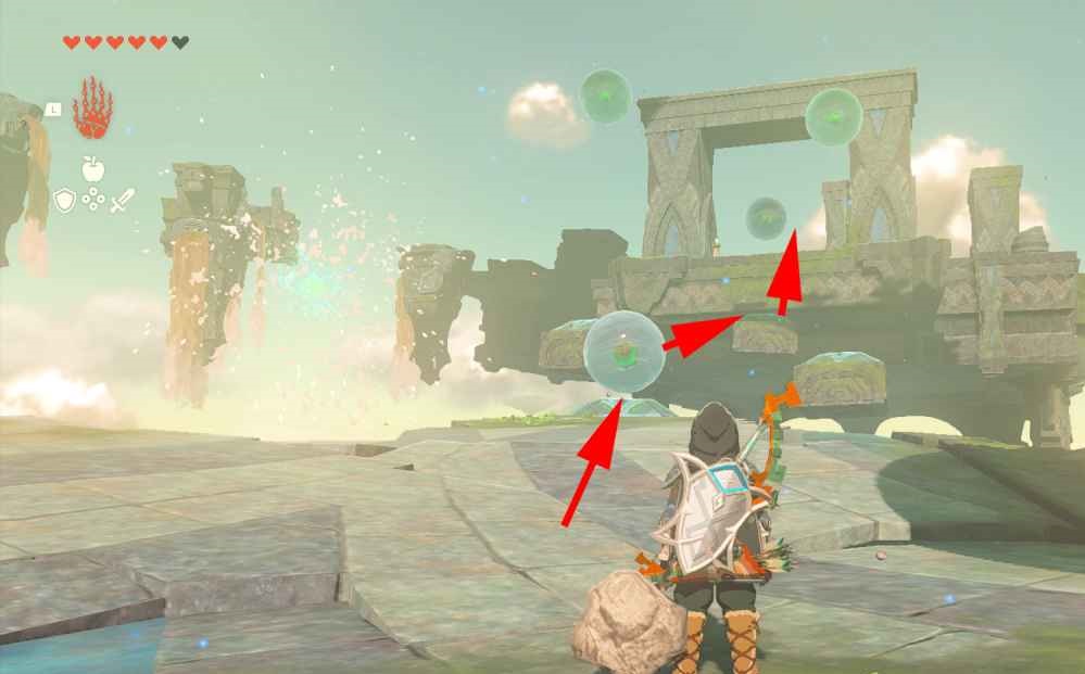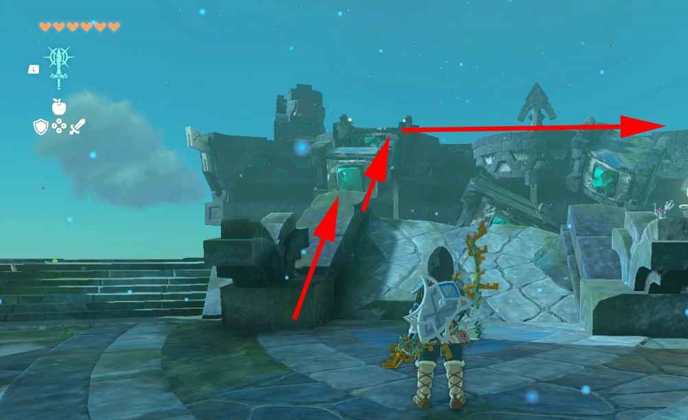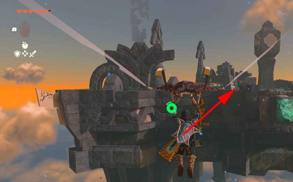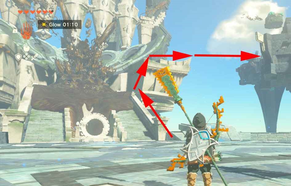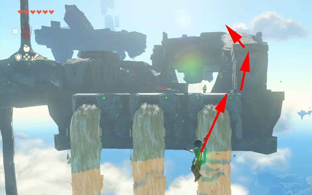 Сверху — враг и сундук. Встаньте у сундука, лицом к столбу. По бокам от столба есть сосульки. Стреляйте в них из лука, чтобы создать отверстие, и летите туда. Повторно используйте вознесение, чтобы попасть на вершину колонны. Летите к вратам Тории. Перемещайтесь по платформам, пока не дойдете до платформы со льдом. Прыгните пару раз на лед, чтобы его разбить, и обнаружите лодку. Подпрыгните вверх и летите к следующему острову со льдом. Разбейте его, чтобы найти парус, а затем подпрыгните и летите на платформу слева. По желанию можно также разрушить сосульки справа, чтобы найти сундук.