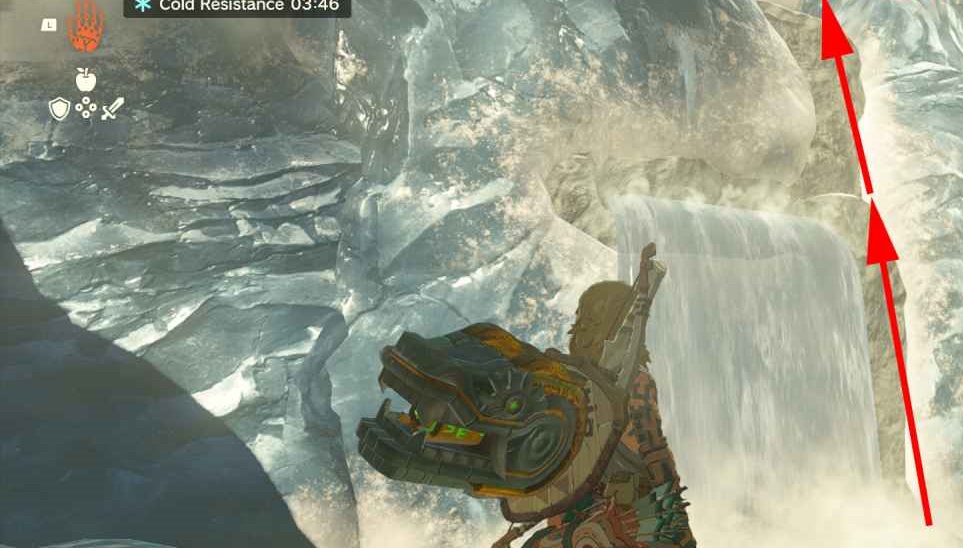 За водопадом расположена стена, на которую можно взобраться. По стенам со льдом подниматься нельзя. Вы должны подняться именно по этой стене за водопадом. Наверху будет храм. При входе в Храм вы получите способность к телепортации. Выберите ее, встаньте под потолком в конце пути и активируйте умение, чтобы подняться на один ярус выше.