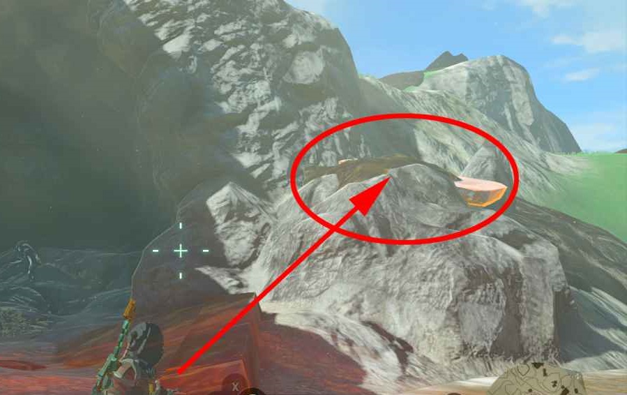 Шаг 1. От смотровой площадки идите на юго-восток. Активируйте небоскреб Хайрула, чтобы открыть карту. Продолжайте двигаться к горам. Пройдите мимо мини-конюшни, а затем — чего-то похожего на шахтерский лагерь. Там будут лестницы, ведущие на холм. Поднявшись по последней лестнице, карабкайтесь по стене.