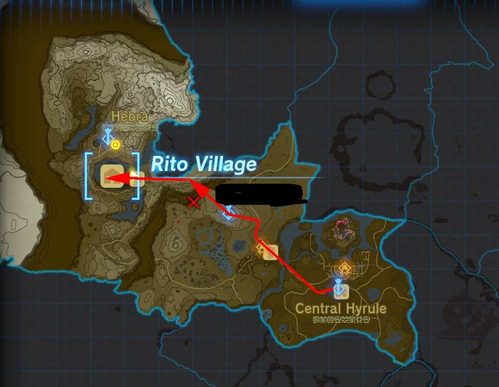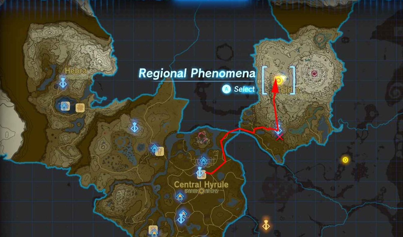 В этом прохождении мы будем посещать цели в следующем порядке: Хебра (северо-запад), Элдин (северо-восток), Ланайру (восток), Герудо (юго-запад). Идите на северо-восток к маркеру. Путь можно увидеть на скриншоте ниже: