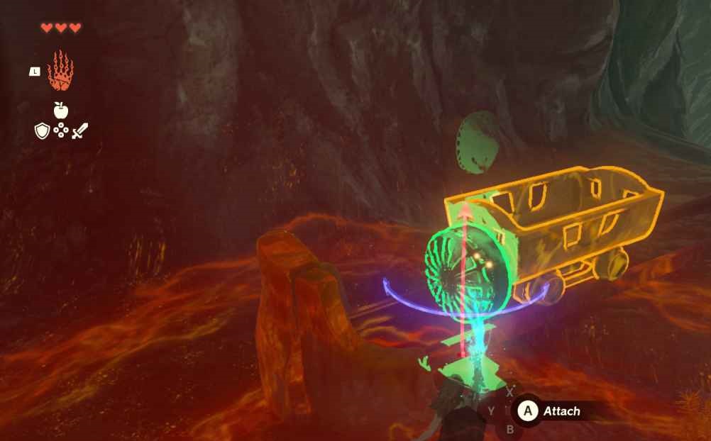 В ней будет темно, но вы можете создать источник света, ударив по семенам яркоцвета атакой ближнего боя. Вы также можете собрать семена, бросить в нужное место, а затем атаковать, чтобы осветить область. По всей пещере разрушайте камни, чтобы получить зонаит — материал, который можно обменять в кузницах на заряды Зонай (для питания устройств) и кристаллизованные заряды. Ближе к концу пещеры будет кузница, где вы и сможете это сделать в первый раз. Поговорите с шахтером в конце пещеры, откуда виден яркий свет. Откройте инвентарь, перейдите на устройства зонаи, выберите вентилятор и извлеките деталь. Прикрепите его к задней части вагонетки. Затем поставьте вагонетку на рельсы, залезьте внутрь и ударьте по вентилятору, чтобы его запустить и поехать по рельсам.