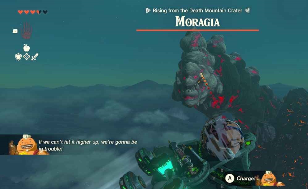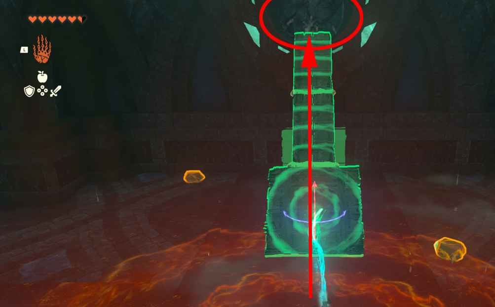Развернитесь около второго замка и используйте рывок Юнобо на больших камнях с правой стороны лавового бассейна. Он их сломает, и вы обнаружите еще один гидрант. Прыгайте по созданным в лаве камням. Вернитесь к рельсам, от которых сюда шли, разверните вагонетку и используйте лук, чтобы пустить стрелу в зеленый колокольчик на другой стороне — тот, в который стреляли ранее, чтобы опустить рельсы. Так вы поднимите рельсы. Используйте вагонетку, чтобы попасть на следующий этаж. На расстоянии будет противник. Убейте рывков Юбобо и увидите на стене несколько ракет. Возьмите одну при помощи руки и поставьте перед вагонеткой (не сзади)!