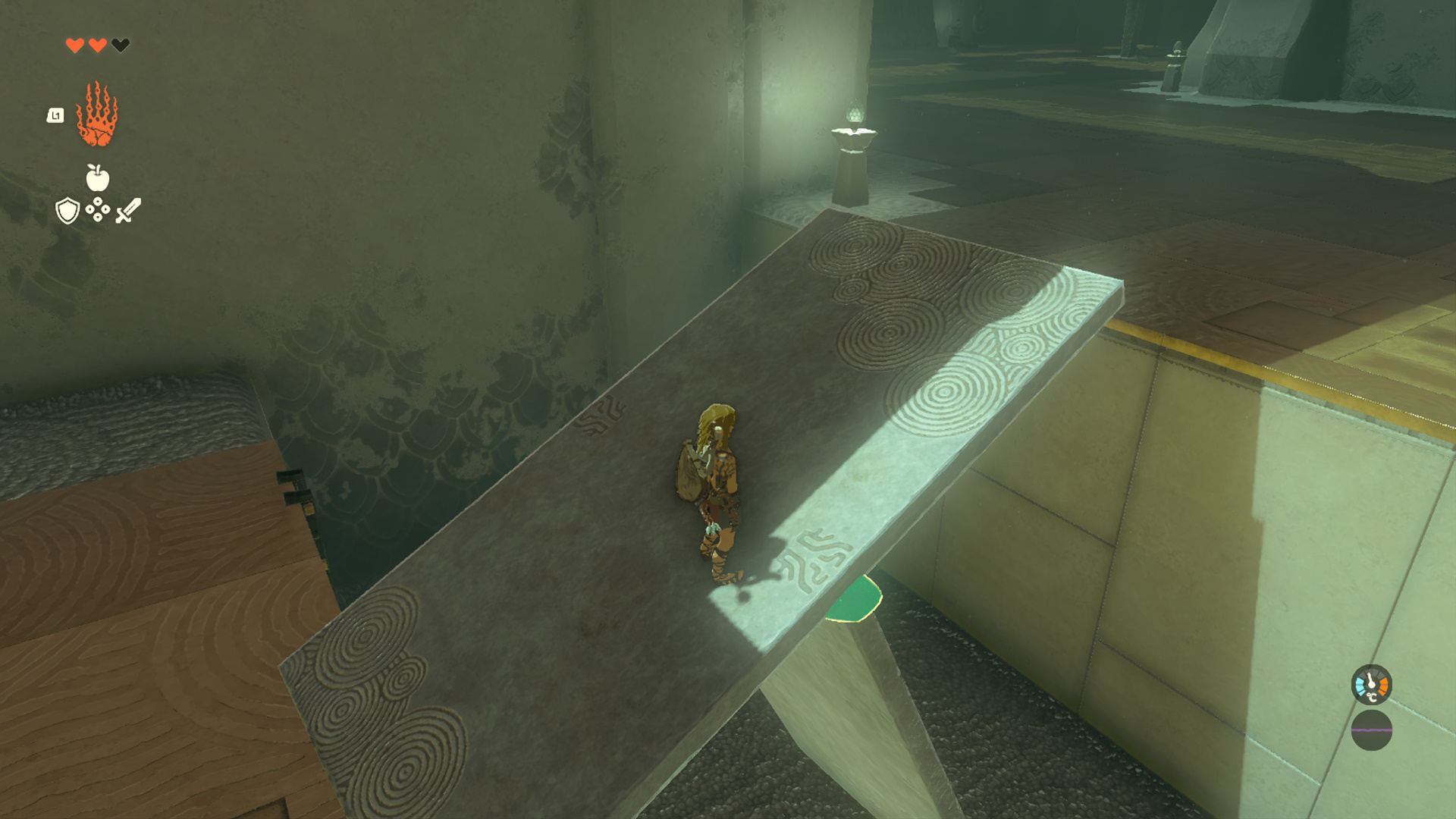Используйте комбокинез на ближайшей плите у правой стены, поверните ее и бросьте так, чтобы создать мост на другую сторону. Перейдите и возьмите другую плиту. Прикрепите ко второй так, чтобы получилась фигура в виде буквы «Т». Поставьте букву т, наклонив одну из сторон к себе. Поднимитесь и перепрыгните на другую сторону. Повесьте два металлических крюка, а затем прикрепите к ним деревянную платформу. Она сразу начнет движение, так что запрыгните сверху и активируйте святилище.