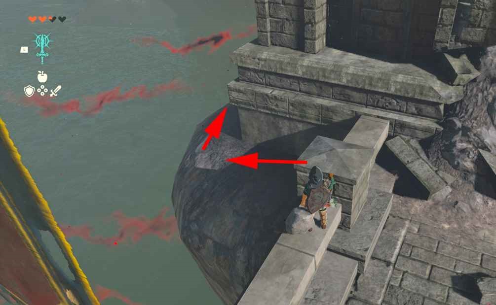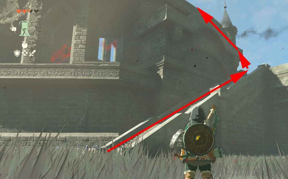 От четвертого замка спуститесь на северо-западную платформу третьего этажа. Есть два варианта добраться до последнего замка. Поднимитесь на башню на северо-западе третьего этажа, пока не сможете взобраться выше. Вы можете передохнуть на уступах, восстанавливая выносливость. Вскоре после начала подъема вы найдете скалы, торчащие из стены. Они мешают подняться выше. Прямо под камнями находится длинный уступ, на который можно встать. Он огибает башню.
