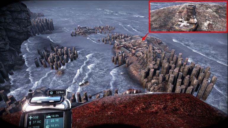 За вторым бортовым самописцем из воды торчит монумент. Если забраться на скалу слева от него, то можно увидеть небольшой скалистый островок справа, рядом с ребрами каркаса корабля. На нем лежит реликвия жизни.