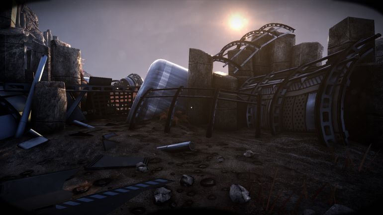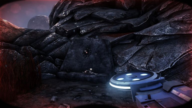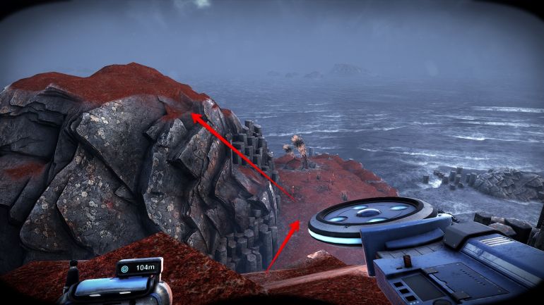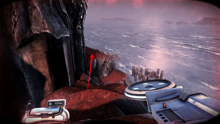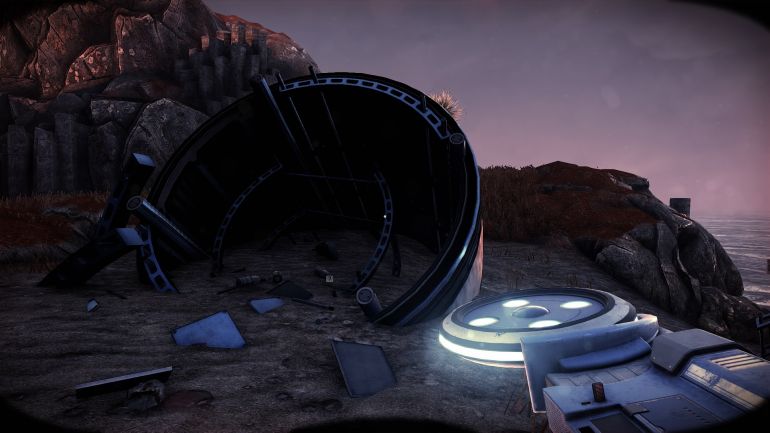 Прямо за упавшей капсулой на скале лежат обломки каркаса космического корабля. С помощью телепортатора поднимитесь к ним и следуйте дальше на возвышенность.