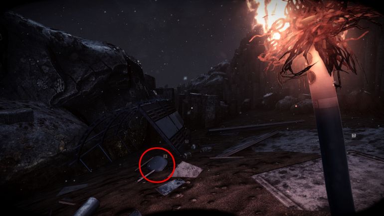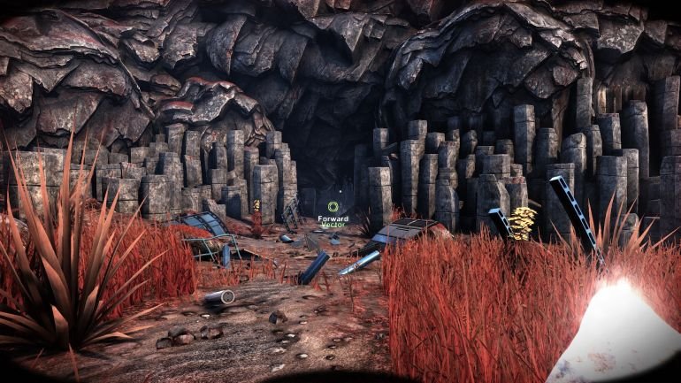 Впереди будут лежать обломки двигателя, слева от них виден вход в пещеру, в которую вам нужно зайти. Там вы найдете мох, камни и еще палки из которых можно соорудить факел.