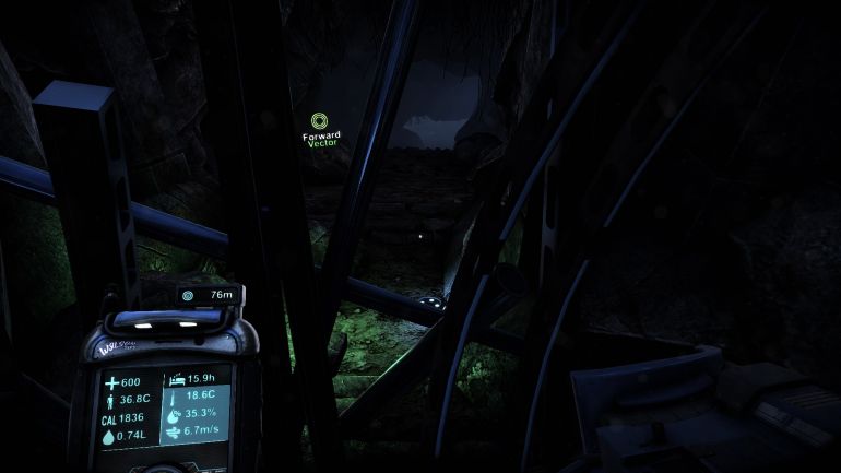 Выживание в неприветливом климате чужой планеты начинается после того, как вы выберетесь из спасательной капсулы. Рядом с камнями будут лежать предметы: фляги, палки и записи. Подберите все, что найдете вокруг места крушения. Оно вам потом пригодится.
