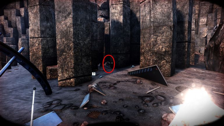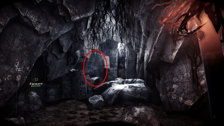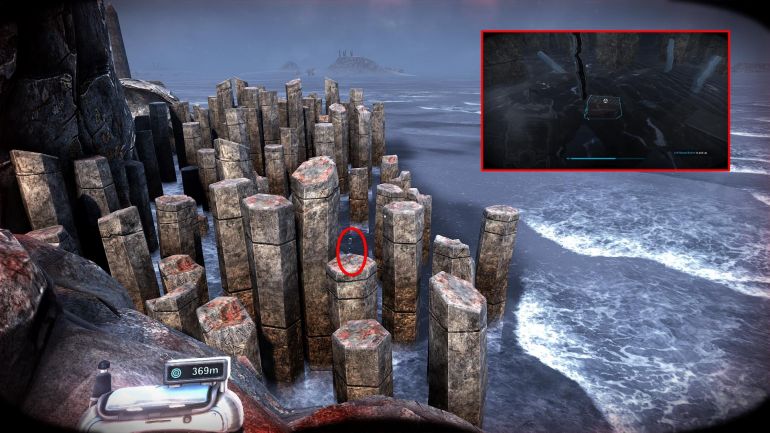 Вернитесь к горящему двигателю и продолжайте идти вдоль кромки воды. Слева, у одной из скал, вы увидите стену восьмиугольных столбов. В ней есть скрытый вход пещеру.