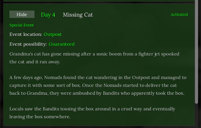 Первое, что вам нужно сделать — дождаться появления события «Пропавший кот». Играйте как обычно, отдыхайте в кровати для ускорения времени и обязательно собирайте как можно больше медикаментов и пищи. Они вам пригодятся.