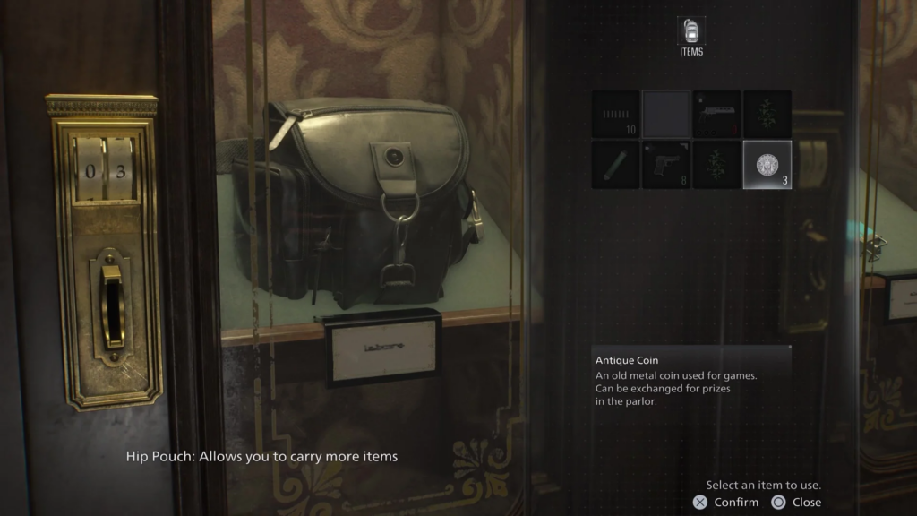 Первый подсумок в игре можно найти в гостиной. В любом случае вам придется открыть эту комнату, чтобы получить ключ-карту от восточного крыла. Подсумок лежит в шкафчике, который открывается в обмен на 3 древние монеты.