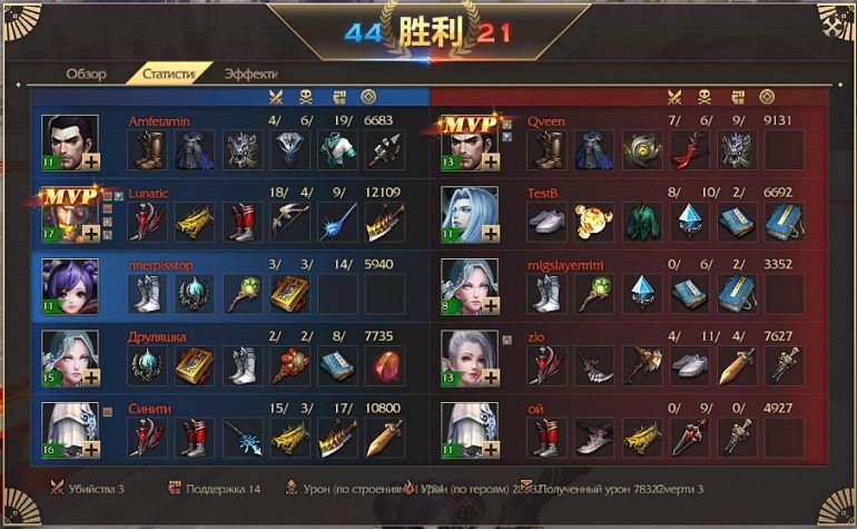В конце матча игрокам будет доступен итоговый счет, где вы можете увидеть статистику обеих команд, а также инвентарь со всеми купленными предметами. Удобно, если вы задаетесь вопросом, как именно одеть вашего героя.