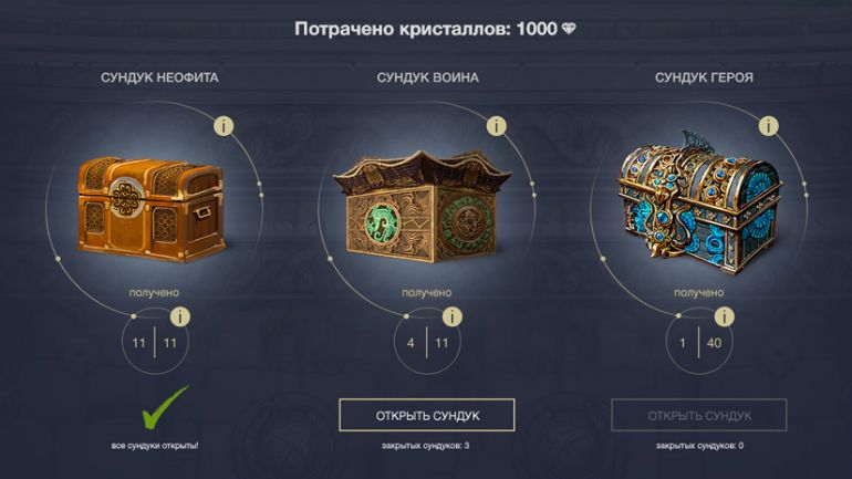 Даже если вы не планировали участвовать в подобного рода акциях, достаточно было потратить 200 кристаллов, чтобы получить 10 сундуков неофита и еще дополнительно по одному сундуку каждого вида. Среди всего многообразия полезных предметов можно выделить следующее: мерцающие и искрящиеся рунические камни брактеата из сундука неофита, оттиск эмблемы из сундука воина и простая императорская тушь и малый драконий фиал из сундука героя.