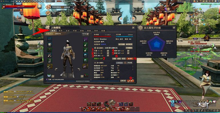 Очки можно распределять вручную, нажимая «+» и «–» рядом с соответствующим параметром, и автоматически — специальными кнопками (6), которые находятся рядом с отображением свободных очков характеристик (7). Применяются изменения нажатием соответствующей кнопки (8). Кнопка для перехода на следующий уровень находится в правом нижнем углу окна характеристик персонажа (9).