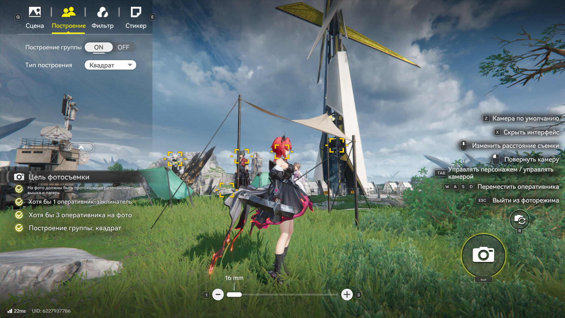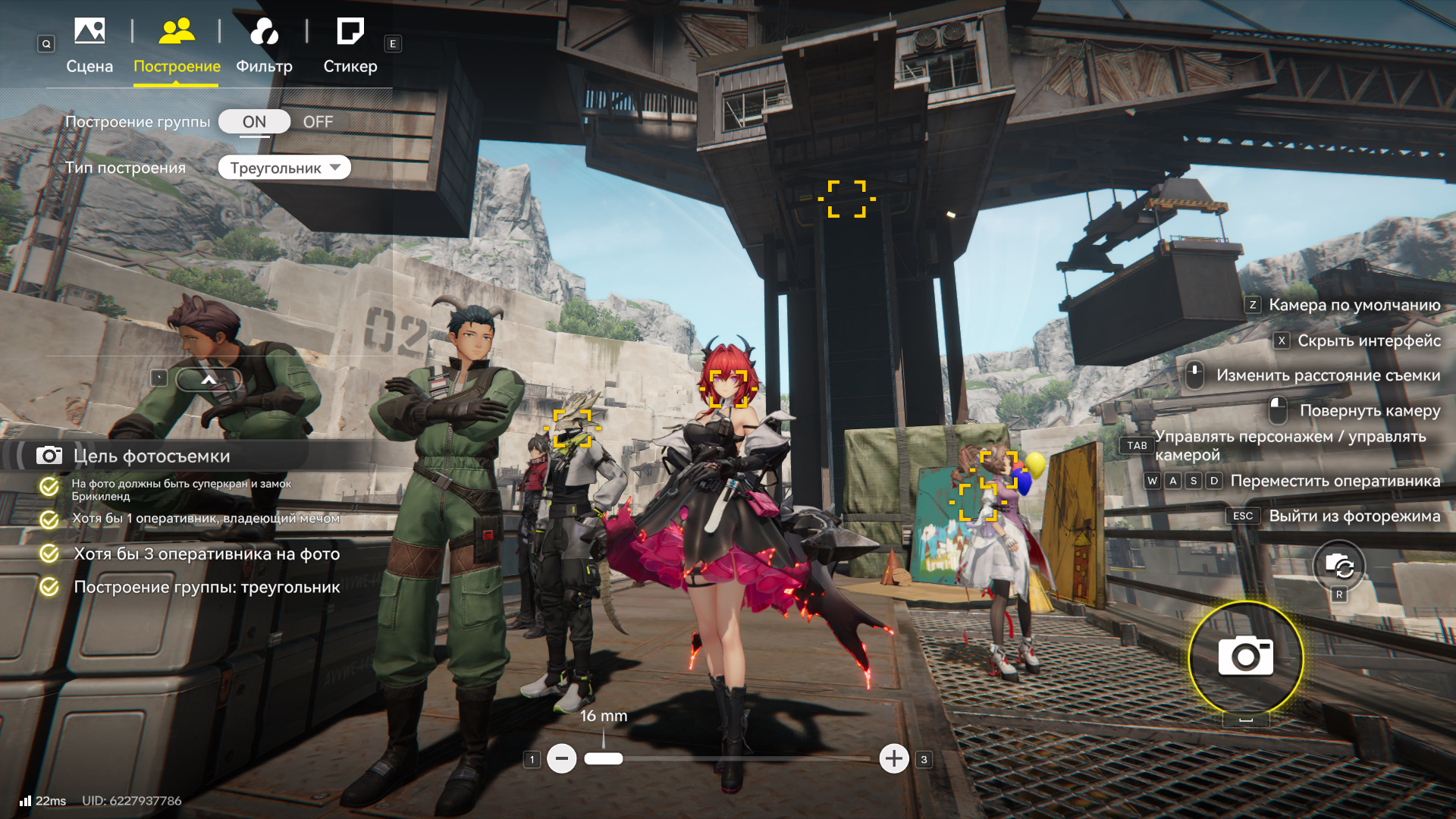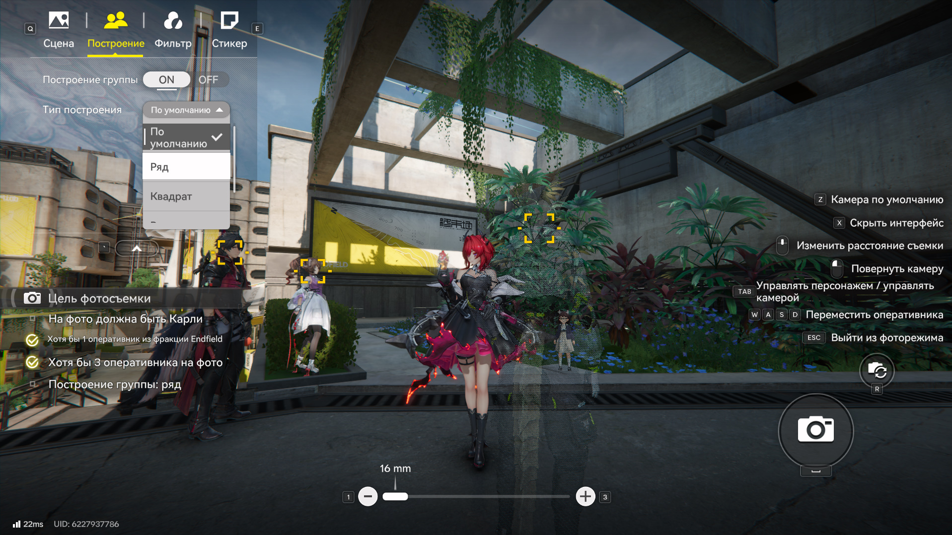 Нужно соблюсти все условия. Вы уже находитесь в нужном месте. Нажмите на клавишу F, чтобы перейти в режим фотосъемки. Далее в левом верхнем углу выберите «Построение» и в графе «Тип построения» укажите «Ряд», как это указано в условиях. Убедитесь, что у вас есть минимум 3 оперативника в команде. Один из них должен быть из компании Endfield (фракция указана в профиле на вкладке оперативника, в правом нижнем углу экрана).