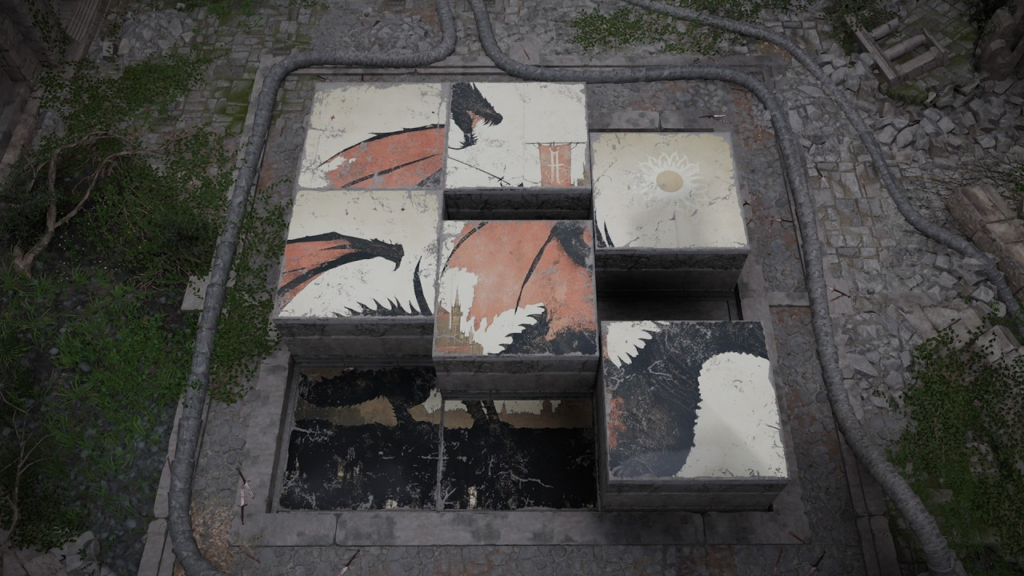 Это головоломка с перемещающимися блоками, в которой нужно переставлять элементы так, чтобы получилась цельная картина. Вам также потребуется использовать способность «Колющий удар», чтобы перемещать блоки вверх, вниз или в стороны. Решение можно посмотреть на изображении выше.