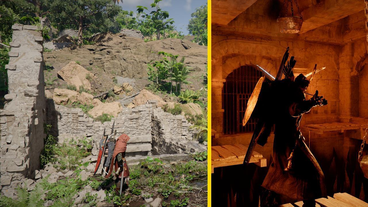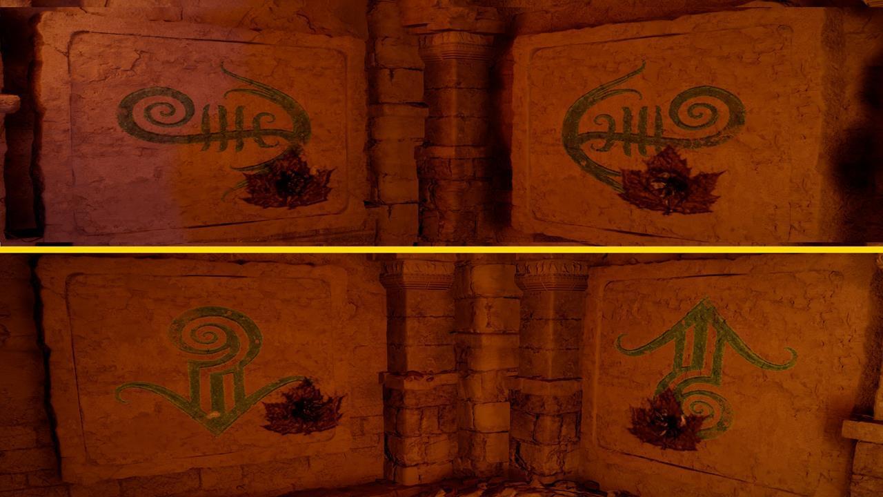 Найдите неподалеку разрушенный дом, покрытый колючими лианами. Сожгите лианы и взгляните на головоломку с настенными изображениями. Обратите внимание, что проход к самой головоломке преграждают ловушки с шипами. Вам нужно выстрелить в веревки, чтобы опустить деревянные платформы.