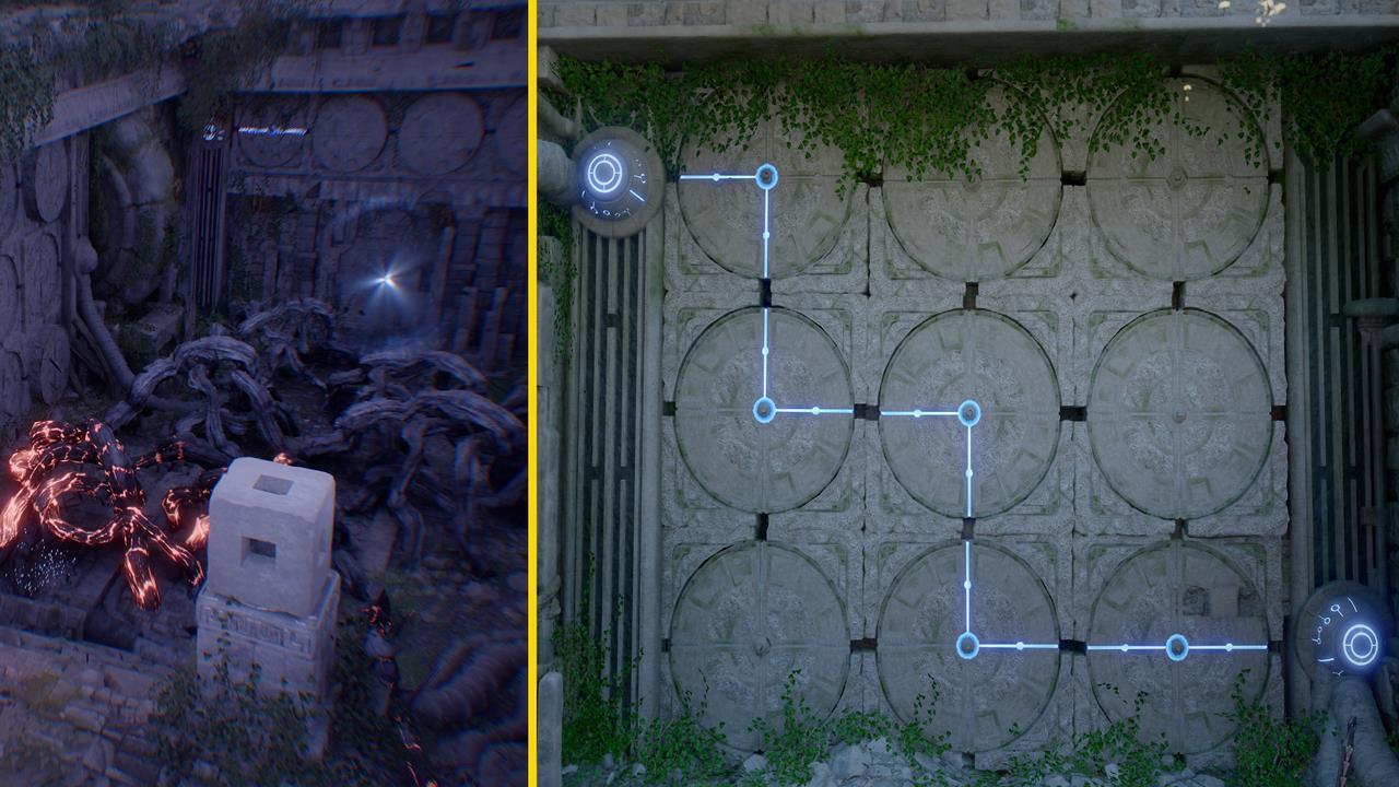 Чем-то напоминает головоломку из самого начала игры, где нужно было давить на настенные блоки, чтобы провести по ним энергию.