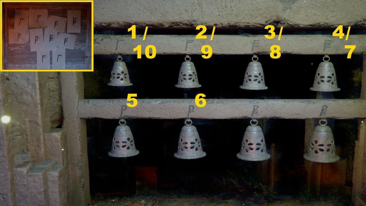 Сначала возьмите киянку и убедитесь, что экипировали инструмент. Киянка лежит рядом с местом решения загадки. Вам нужно ударить по колоколам в соответствии с символами, которые вы видите на доске с левой стороны. Ударьте по 1-6 колоколам в порядке возрастания. Затем вновь ударьте по четвертому, третьему, второму и первому в порядке убывания.