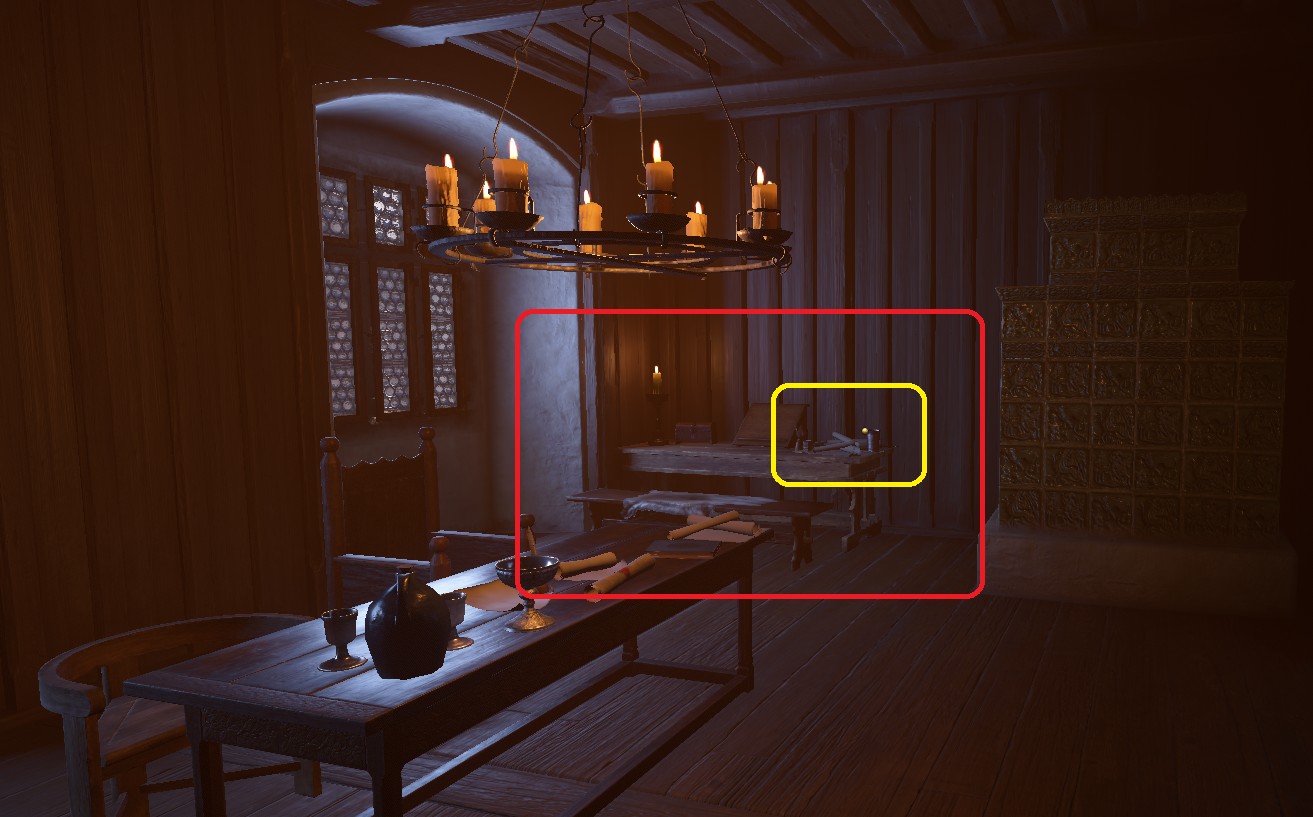 Кубок стоит на центральном столе, прямо напротив входа. Но вас интересует дальний стол, расположенный слева от печи и справа от окна, у стены. Кинжал спрятан в одном из бумажных свертков.