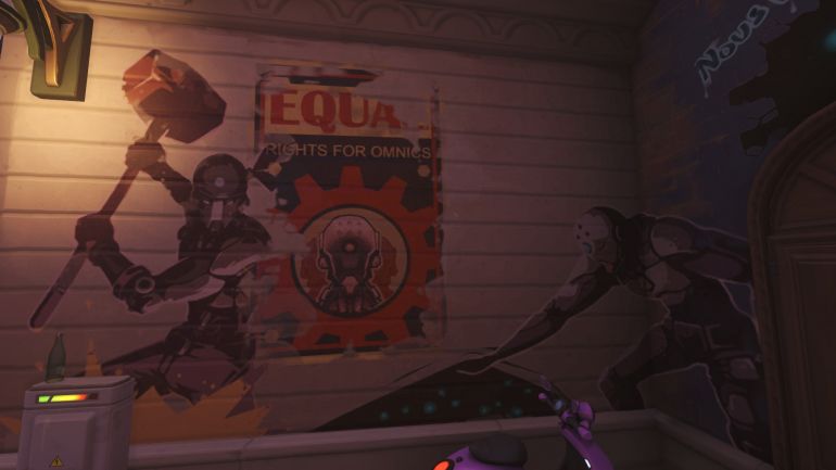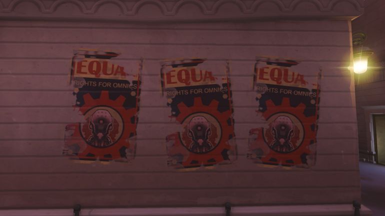 Завязанные глаза на трех омниках в цвета флага Франции отсылает на древнегреческую богиню Фемиду. Для нее равны все живые существа. Омники хотят добиться равноправия по всему миру после восстания машин.