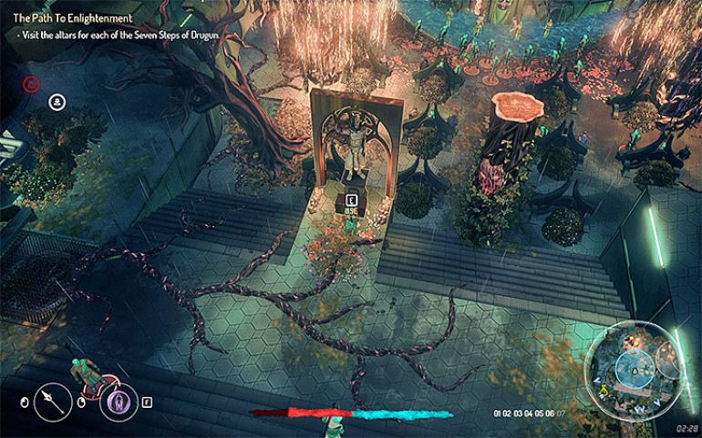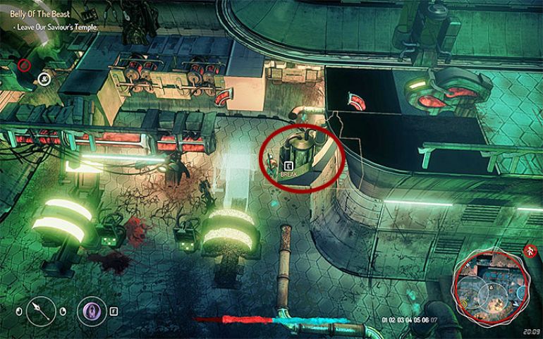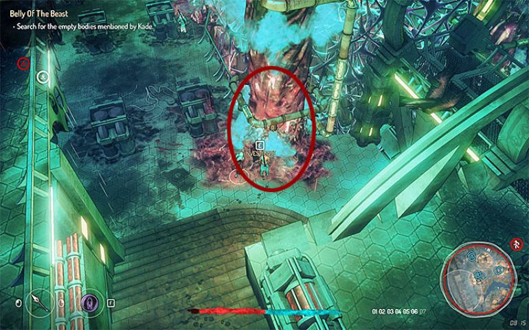 Проникните в храм (желательно, надев костюм биоманта) и доберитесь до нижнего яруса. Активируйте сенсорный режим и исследуйте любые нейронные узлы, которые связаны с живыми людьми. На приведенном выше скриншоте показан пример.