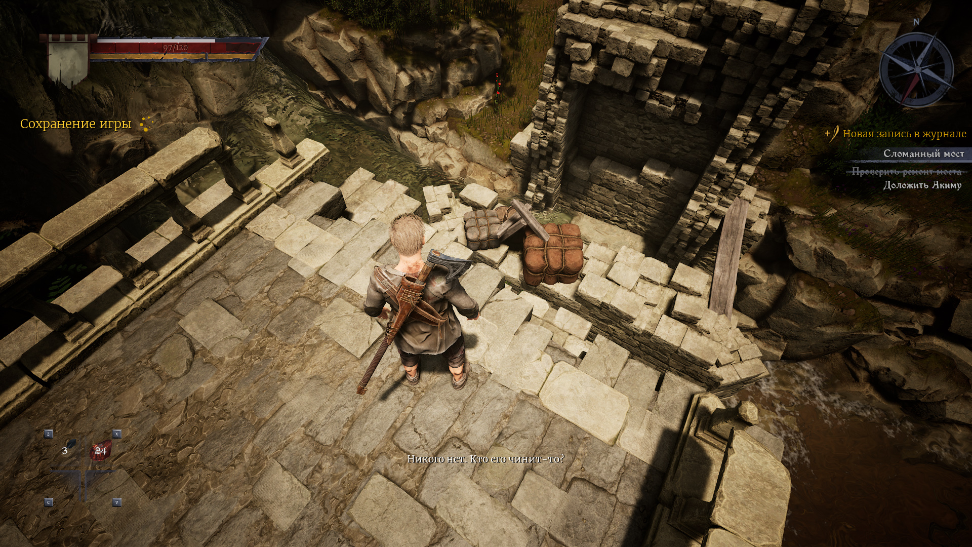 Затем в любом случае его придется сопроводить к мосту. Около моста он заговорит с вами, а после отремонтирует. Доложите об этом Акиму. Никакой дополнительной награды не будет, но отремонтированный мост — самое ценное, что вы можете сейчас получить.