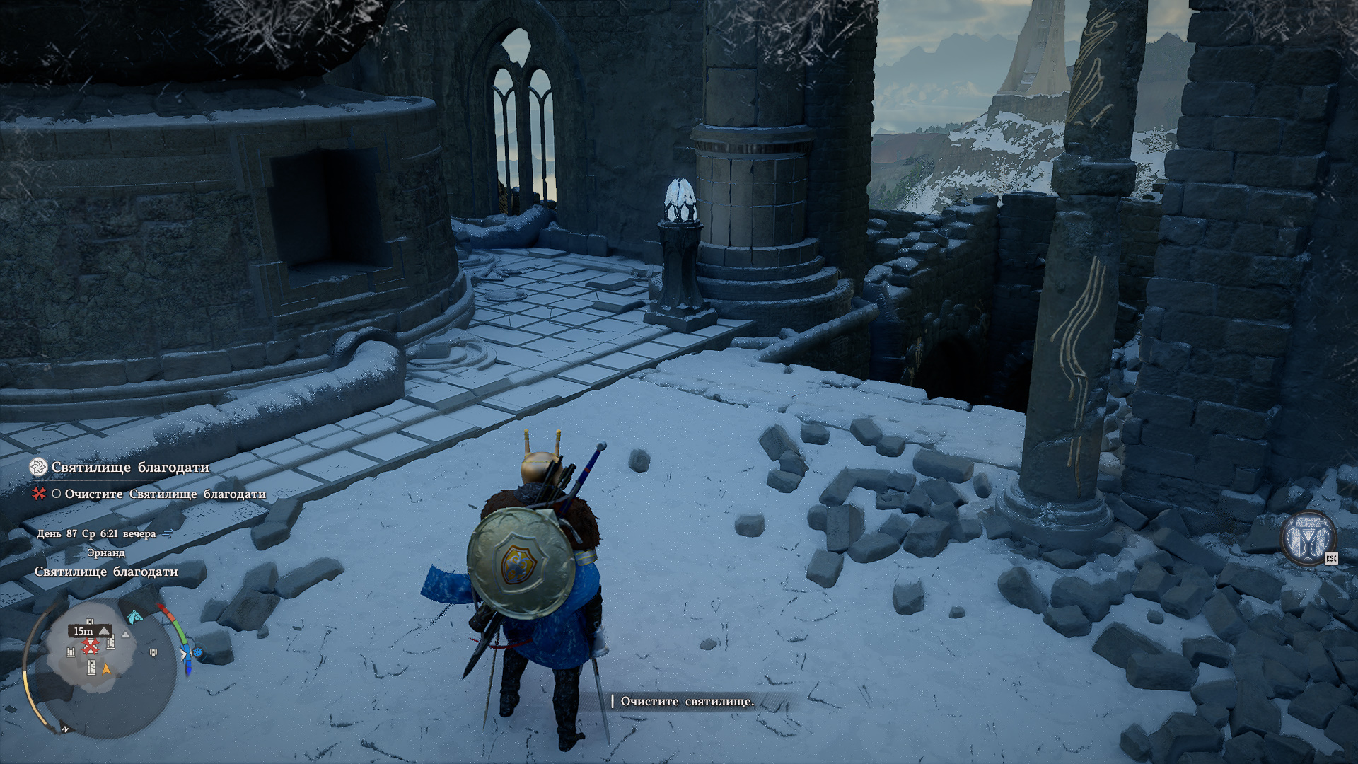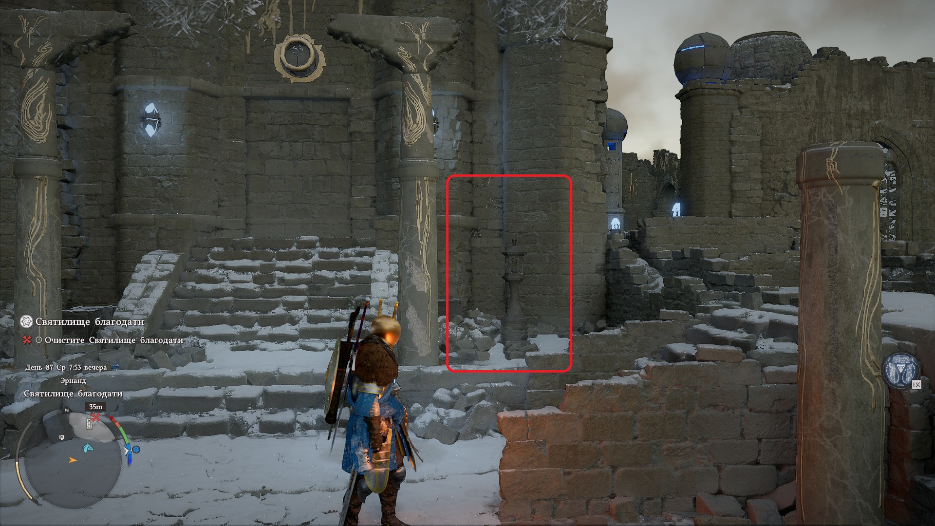 Затем развернитесь от реактора и двигайтесь в противоположную сторону. Пройдите через арку и осмотрите левую стену — рядом находится каменный факел. Зажгите его, после чего преграда исчезнет. Внутри лежит еще один фрагмент колонны.