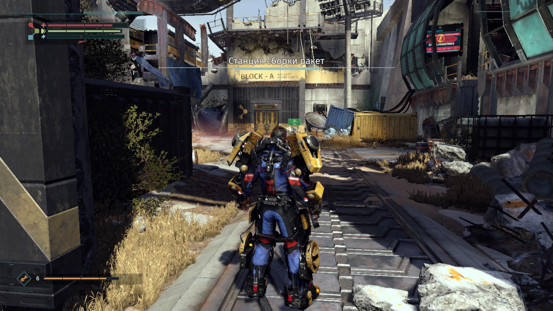 Выходите наружу через огромные двери неподалёку, об которые бился киборг. Справа нужно будет перегрузить силовую цепь. Откройте дверь справа, чтобы получить доступ на предыдущую локацию. Идите через корпус ракеты слева. Здесь будет болото с отравленным воздухом. После корпуса первой ракеты есть поворот направо, в кусты.
