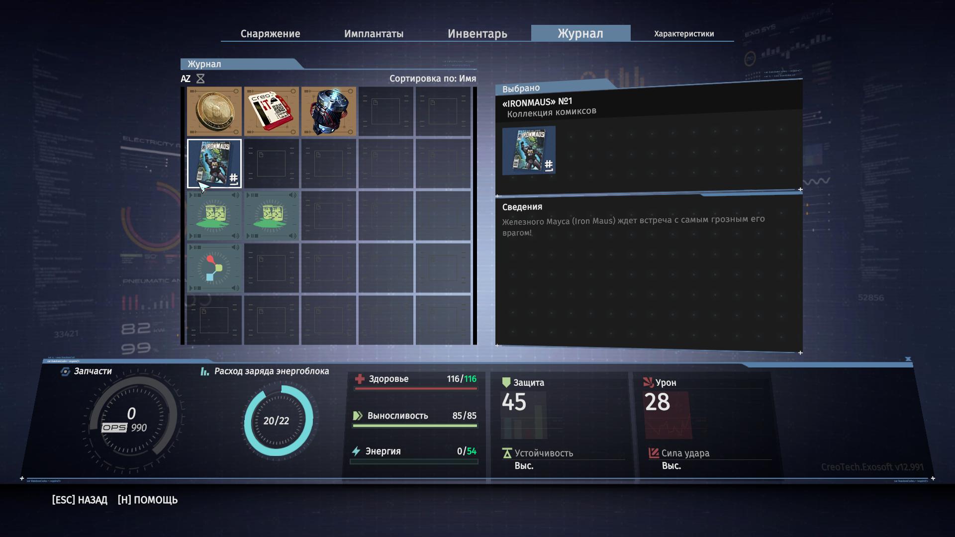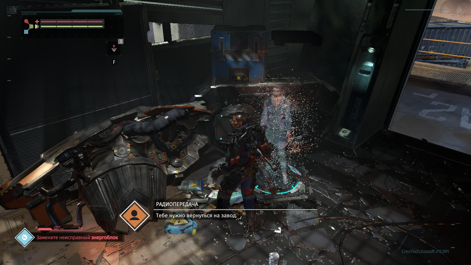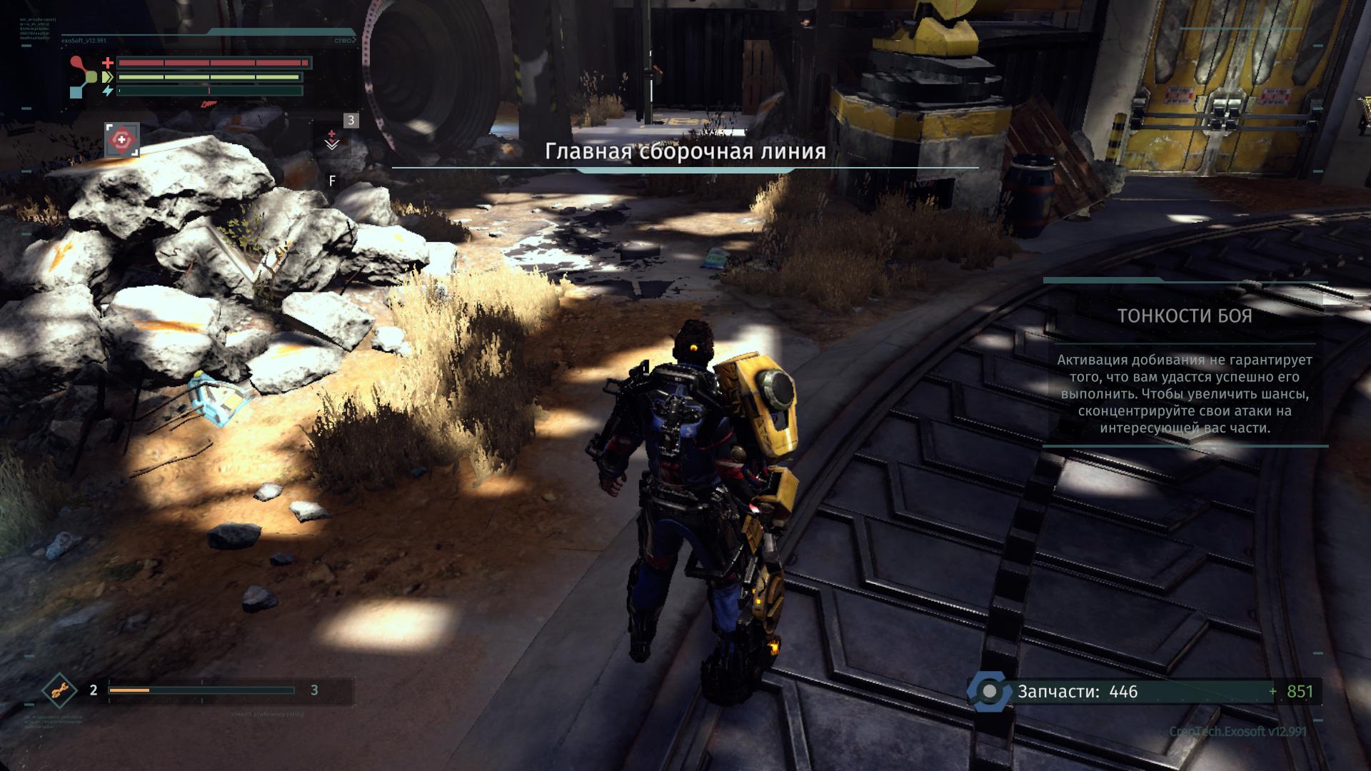 Попав на свалку, есть два пути. Внутри помещения слева находится медицинская станция. Перед ним, убив врагов, вы сможете подобрать второй имплант. Активируйте его в инвентаре (клавиша I), чтобы видеть количество прочности противника (ХП). На медицинской станции улучшения недоступны, поскольку у вас неисправен энергоблок. Но вы можете перейти в раздел «Экзокостюм» и зажать клавишу T. Так вы сохраните ВСЕ найденные запчасти (т. е. теперь, в случае вашей гибели, они не потеряются).