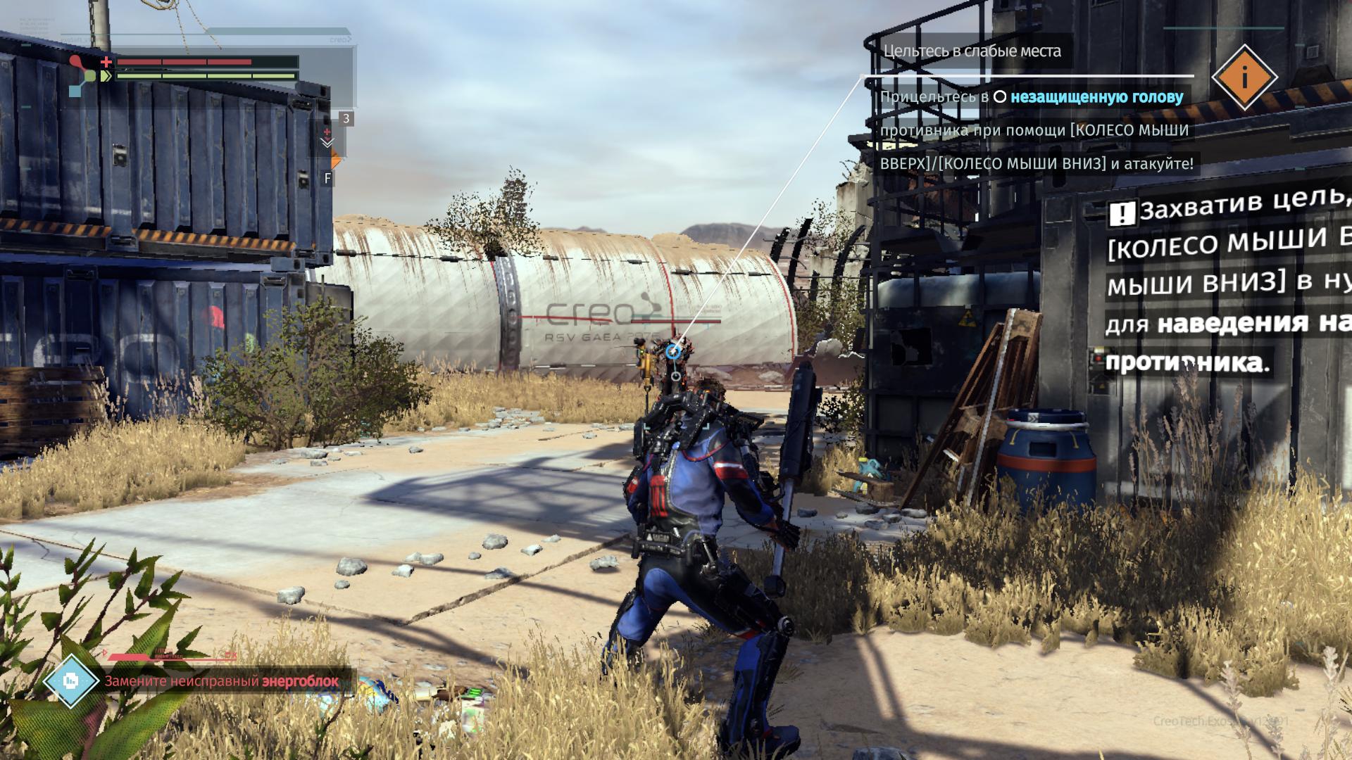 Выходите из Оперцентра на другую сторону и спуститесь вниз. Идите сначала налево. Здесь появятся новые враги — киборги в экзоскелетах. Сначала захватите цель, а затем используйте колёсико мыши, чтобы выбирать незащищённые части тела — они подсвечены синим цветом. По красным и жёлтым частям тела атаковать сложнее, но зато вероятность выпадения каких-то частей и чертежей выше (необходимо добивание, будет доступно спустя несколько минут).