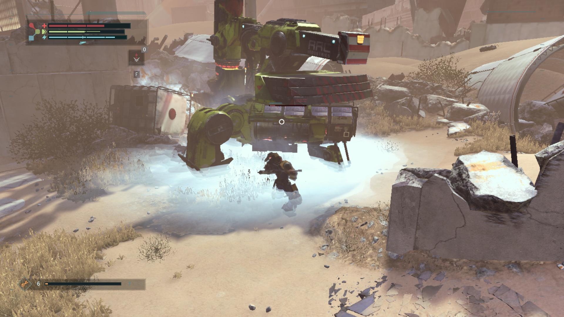 Уничтожьте несколько роботов. Когда убьёте третьего, поднявшись немного в гору, сверните направо и среди обломков найдите добычу — жёлтая пирамида. Такой иконкой отмечена любая добыча — ею может быть всё, что угодно.