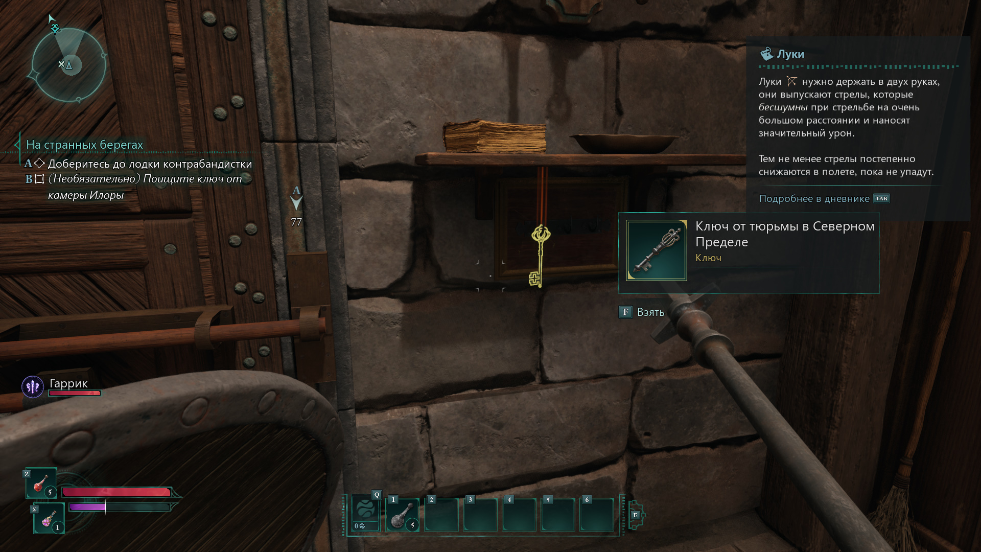 Посмотрите влево, где находится запертая деревянная дверь. Поднимитесь по выступам слева от нее. Вверху есть два варианта — можете игнорировать незнакомку, пройти влево и подобрать лук. Затем экипируйте его и выстрелите в растение над колючками. Оно взорвется, и колючки будут сожжены. Второй вариант — поднявшись, найдите под ногами доски, которые можно разбить. Так вы попадете в комнату за дверью, где на стене висит ключ от тюрьмы Северного Предела. Здесь же лежит записка «Журнал допроса», а также стоит сундук с разной добычей и обычной мантией.