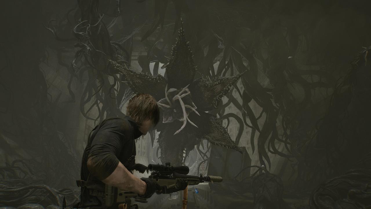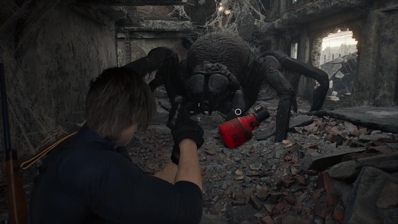 Леон сражается с гигантским пауком в здании NF Building. Продолжайте двигаться, стреляйте по топливным бакам, чтобы нанести дополнительный взрывной урон. К слову, можете попытаться залезать наверх по лестнице, но только после того, как появится паук и спустится вниз.