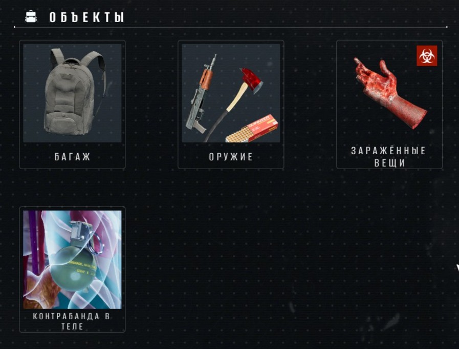 Все симптомы этого раздела доступны сразу, однако последний открывается только после получения рентгена. Формально выбирать «Багаж», «Оружие» или «Контрабанда в теле» как симптомы необязательно — они не влияют на итоговую оценку осмотра и никак не связаны с заражением (за мелким исключением, читайте ниже).