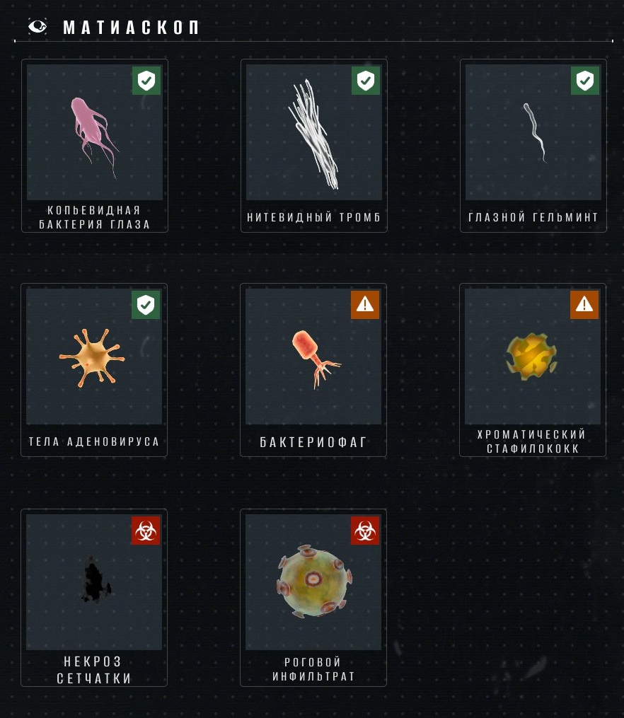 Почти все симптомы можно увидеть уже на первом слое после настройки фокуса (прокрутите колесико мыши до упора вверх). Исключение — «Некроз сетчатки», который обычно очень мал. В текущей версии игры присутствует баг: симптомы, обнаруженные через матиаскоп, могут некорректно учитываться в итогах осмотра. В результате, если у человека много глазных симптомов, вы будете часто получать оценку «Некачественный осмотр».