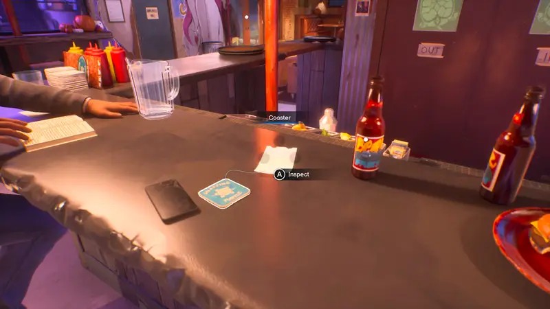 Внутри бара, играя за Хлою, вы будете сидеть рядом с Лукасом. Взаимодействуйте с пивной подставкой слева, переверните ее и увидите изображение коровы/быка. Отойдите, выпейте пиво, затем снова взаимодействуйте с рисунком на обратной стороне подставки, чтобы сделать рисунок.