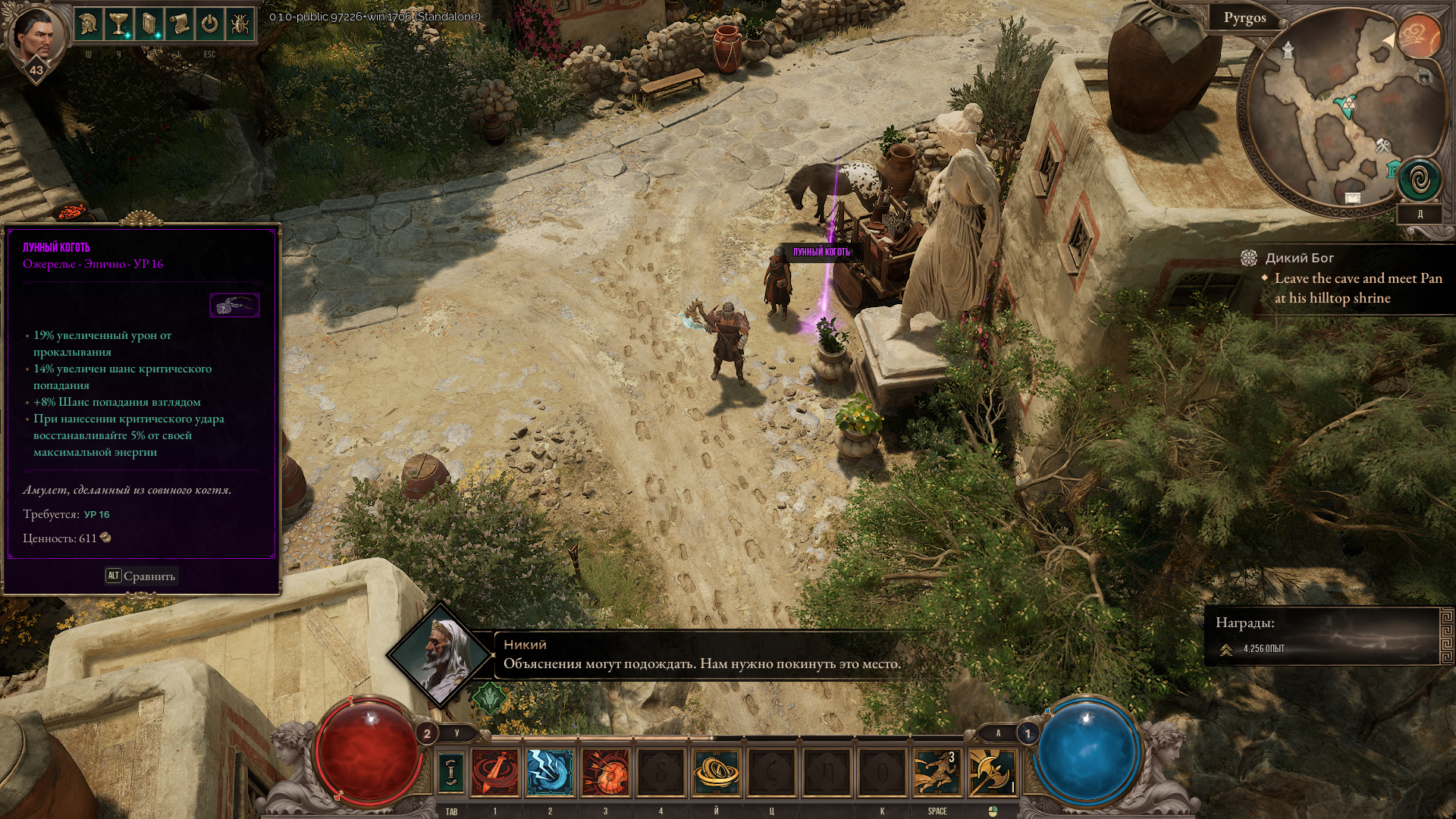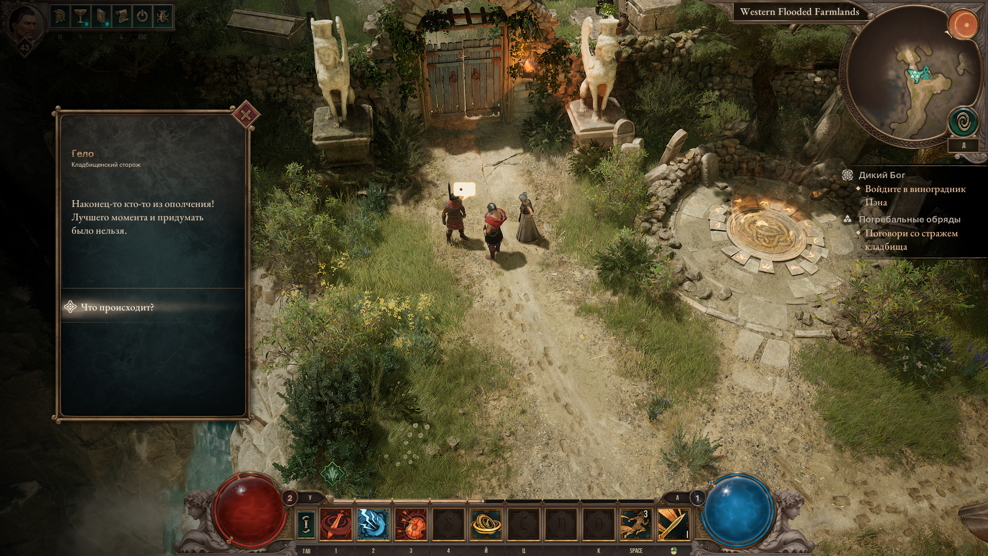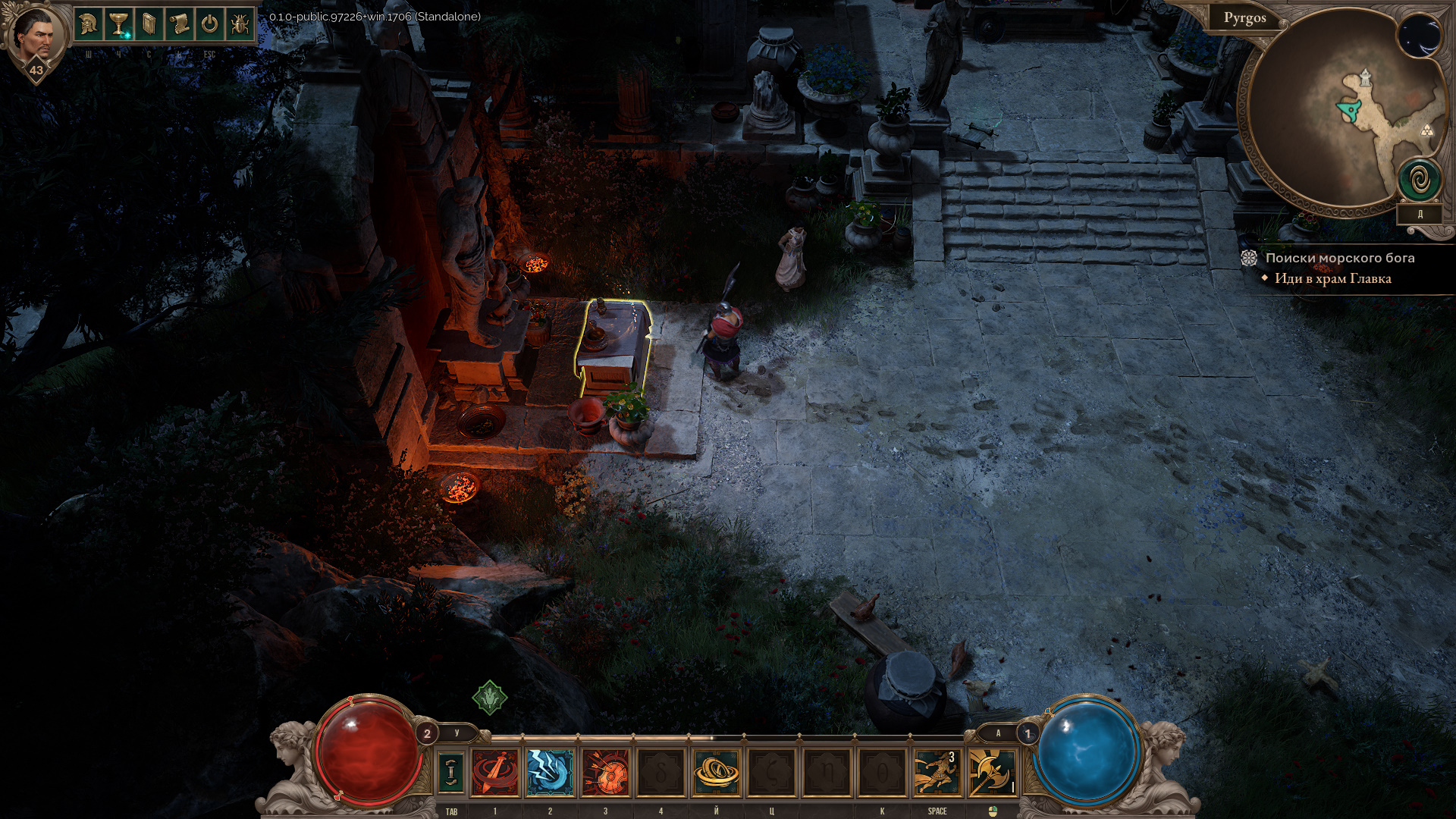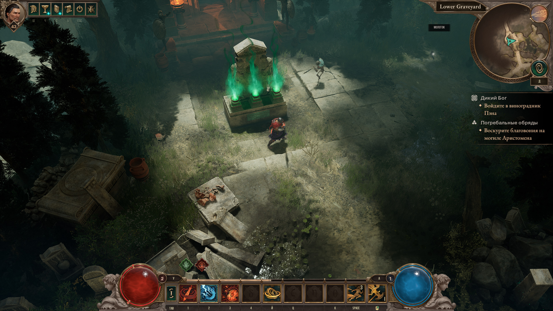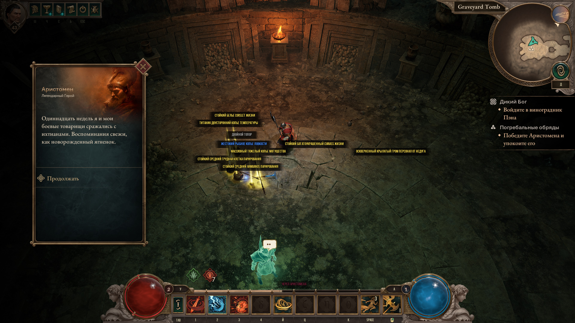 Когда убьете всех трех, на севере ищите вход в склеп. Перед ним стоит памятник, и три чаши должны светиться. Если все так, склеп будет открыт. Войдите внутрь и разожгите в самом конце две чаши. Победите Аристомена и его армию нежити (скелеты исчезнут, когда будет повержен Аристомен). С Аристомена выпадет огромное количество добычи желтого ранга. Поговорите с ним, и появится еще больше лута. Также выпадет череп Аристомена, который можно использовать для его повторного призыва (через алтарь в Пиргосе).