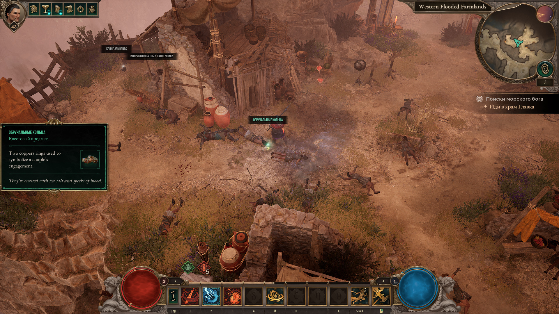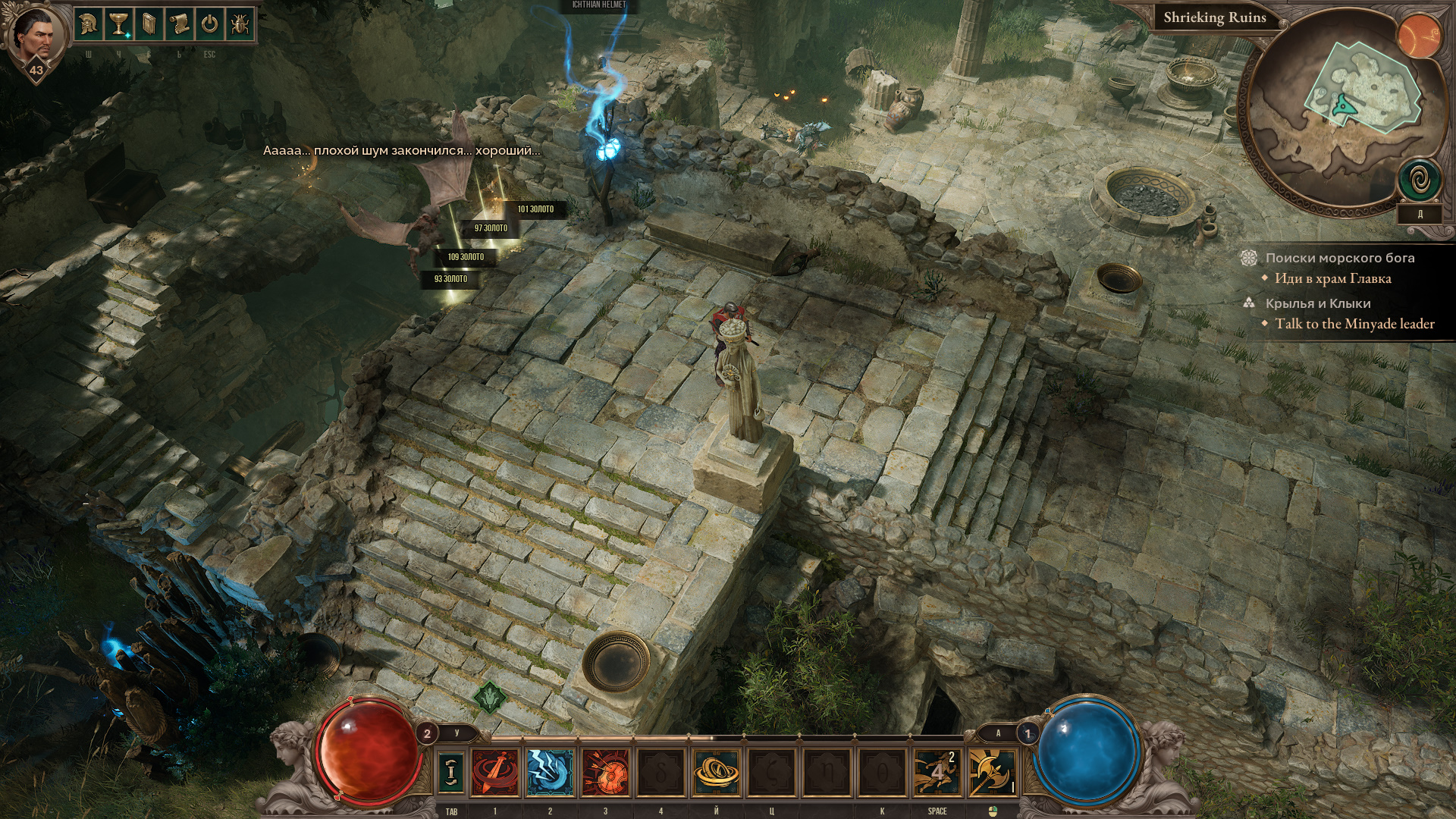 На карте появится выделенная область. Когда попадете в нее, просто зачистите полностью локацию. При этом убивать летучих мышей (миньядов) необязательно. Как только погибнут рыбоголовые, миньяды успокоятся. На выходе из руин вы сможете поговорить с одной из них. Под ней валяются около 400 золотых монет. Вы получите блестящий камень и еще ~300 монет.