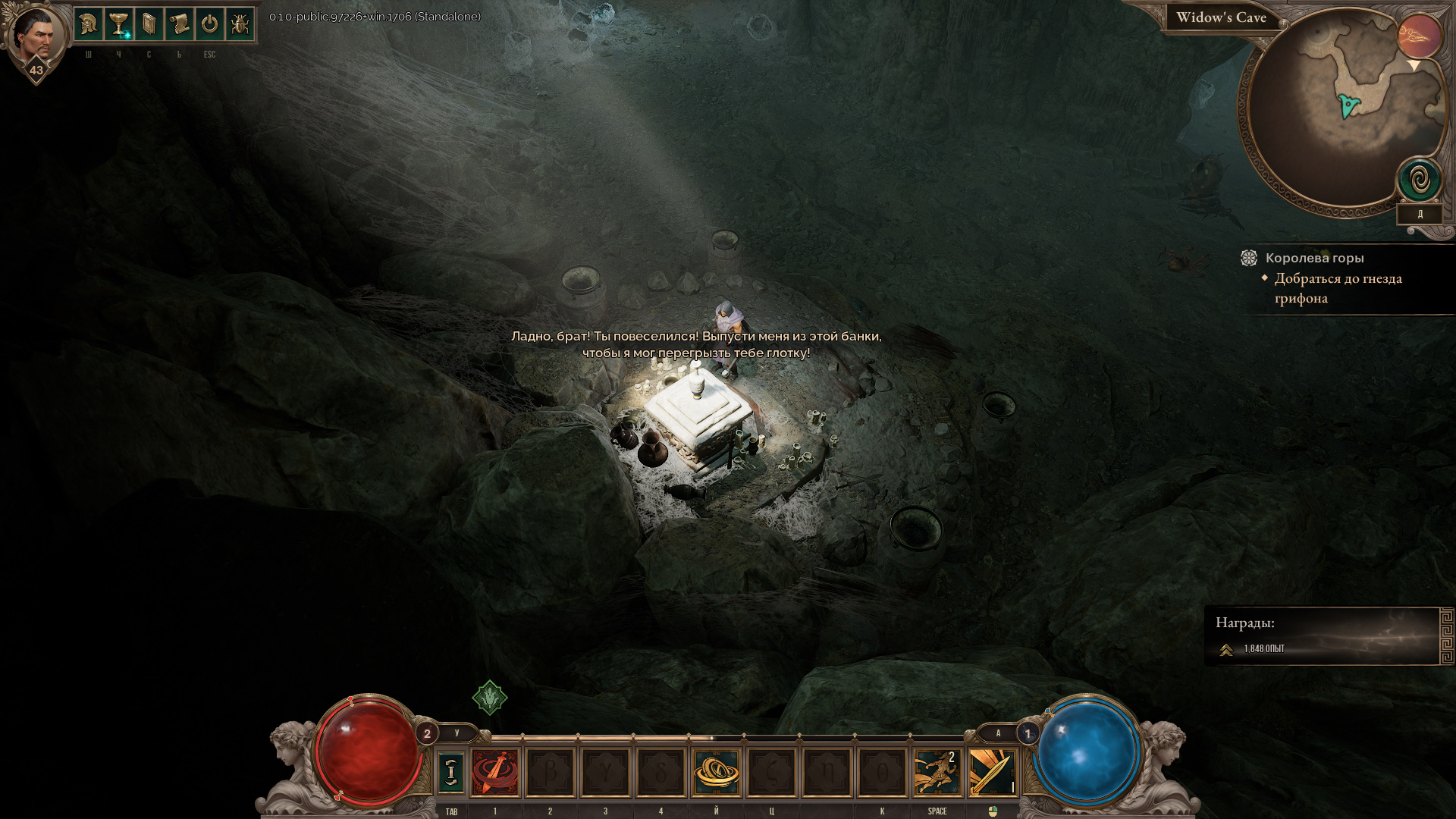 Пещера в целом небольшая, а клетка с пленной сестрой Это находится в правом нижнем углу (на юго-востоке). Освободите ее и поговорите с девушкой. Также в пещере есть Таинственная дверь с жаровнями. У нас есть отдельный гайд, в котором мы рассказываем, как ее открыть. Когда откроете дверь, получите 2440 очков опыта и 10 угольков ночи. Последние используются в побочном задании «Древние угли». Также внутри комнаты за ранее закрытой дверью будет Мопсус. Поговорите с ним. Мужчина здесь прячется, и общаться особо не захочет. Сможете обыскать два сундука, чтобы получить рандомную добычу магической редкости.