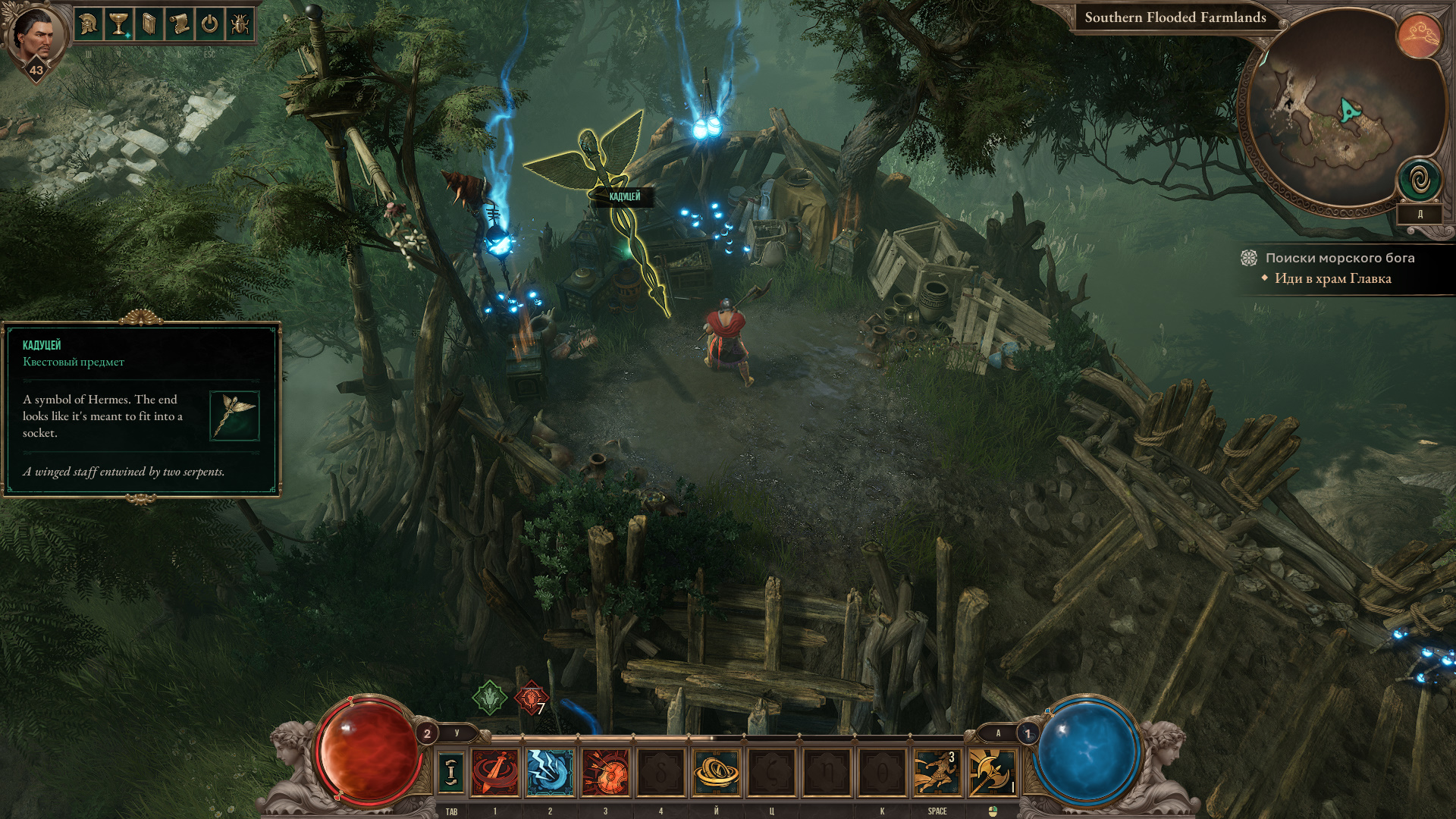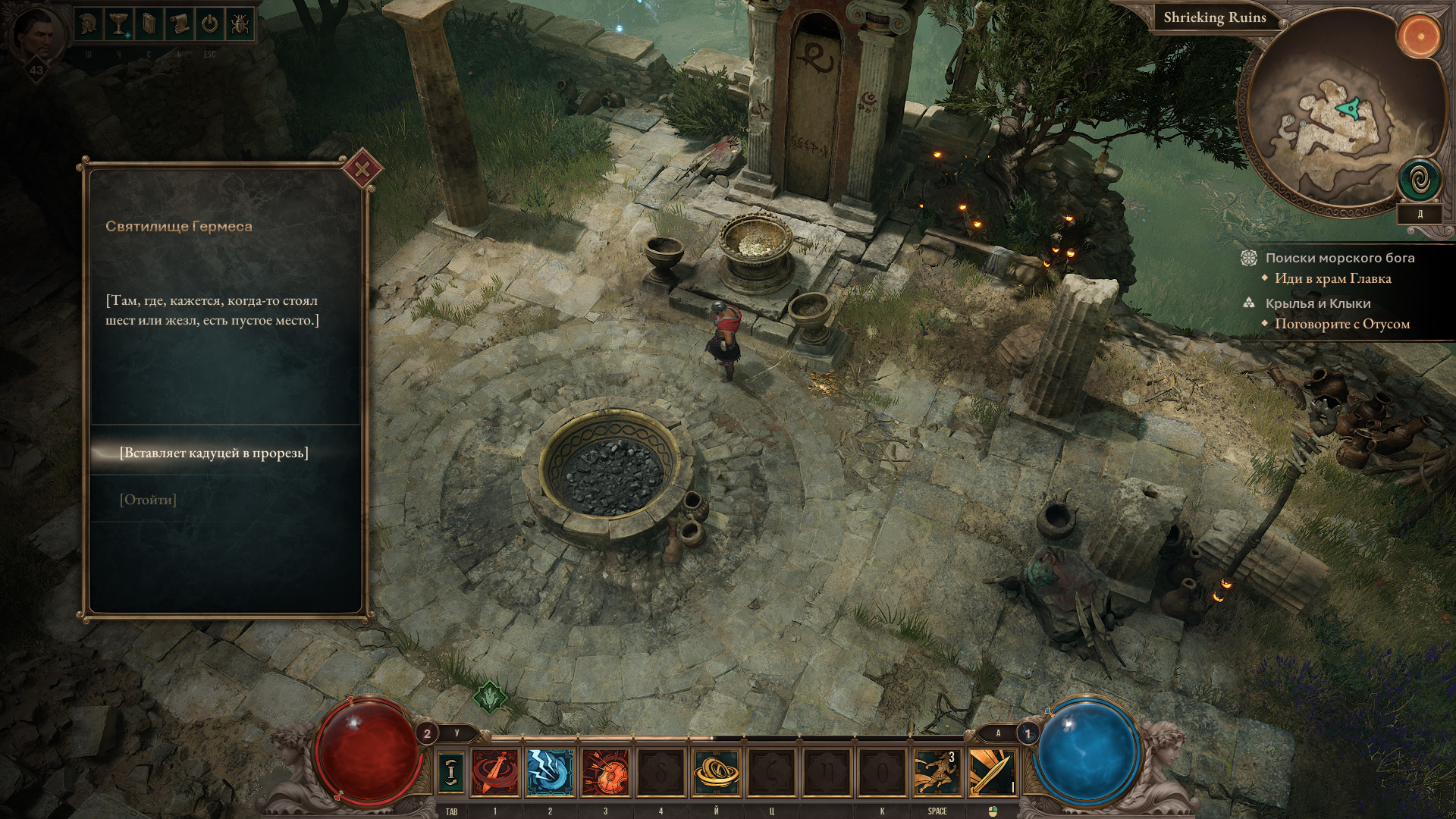 В руинах, где нужно уничтожить рыбоголовых по квесту «Крылья и клыки», есть жаровня, с которой вы можете взаимодействовать. Если это сделать без жезла Кадуцея в инвентаре, увидите подсказку о том, что есть слот под посох или жезл. Жаровня подписана как Святилище Гермеса.
