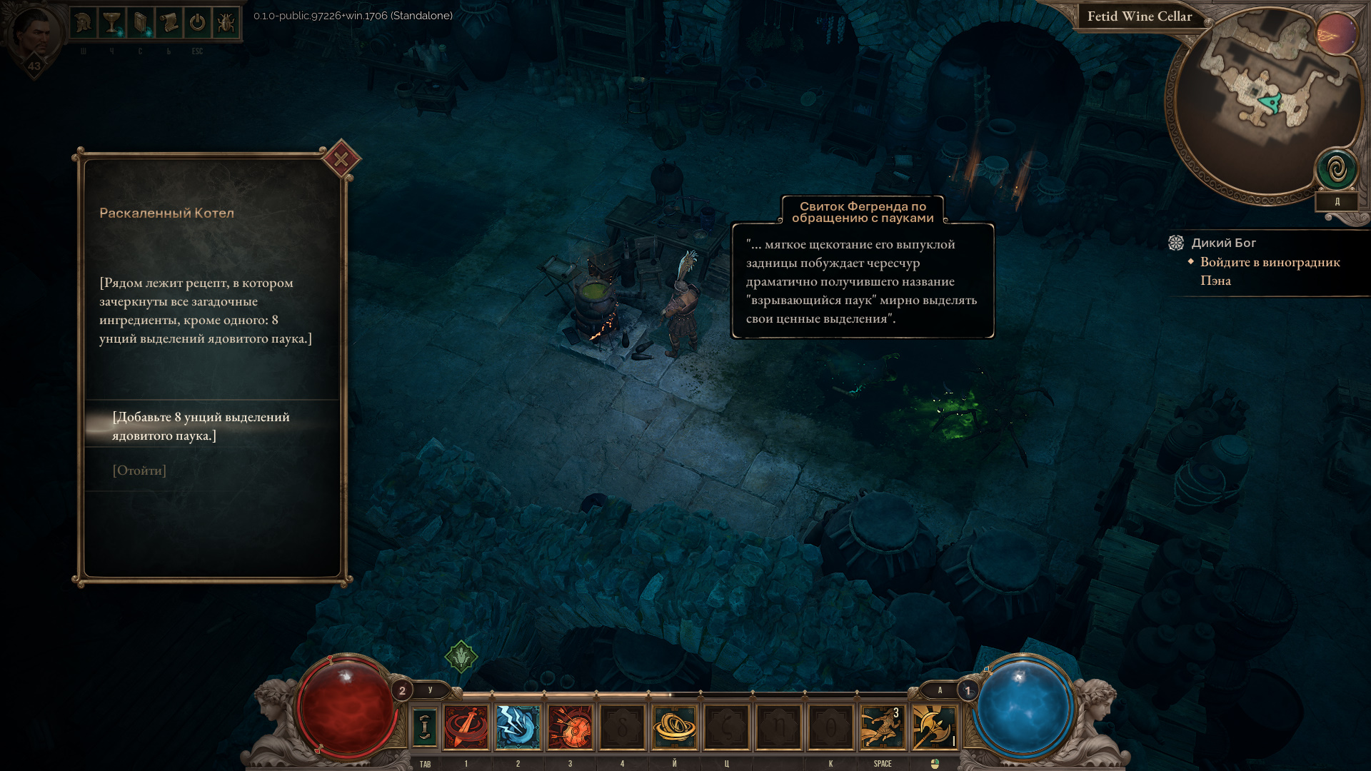 Вы превратитесь в человека. Обыщите подвал и убейте пауков. Нужно найти 7 больших зеленых пауков, с которых выпадут выделения паука. Также рядом с котлом в самом низу лежит восьмое выделение паука. Получив 8 унций выделений, взаимодействуйте с котелком. В квесте есть баг, когда при взаимодействии с котелком, даже если у вас есть все 8 порций, можно только отойти. Столкнулся я с ним, когда входил в погреб с восточного люка.