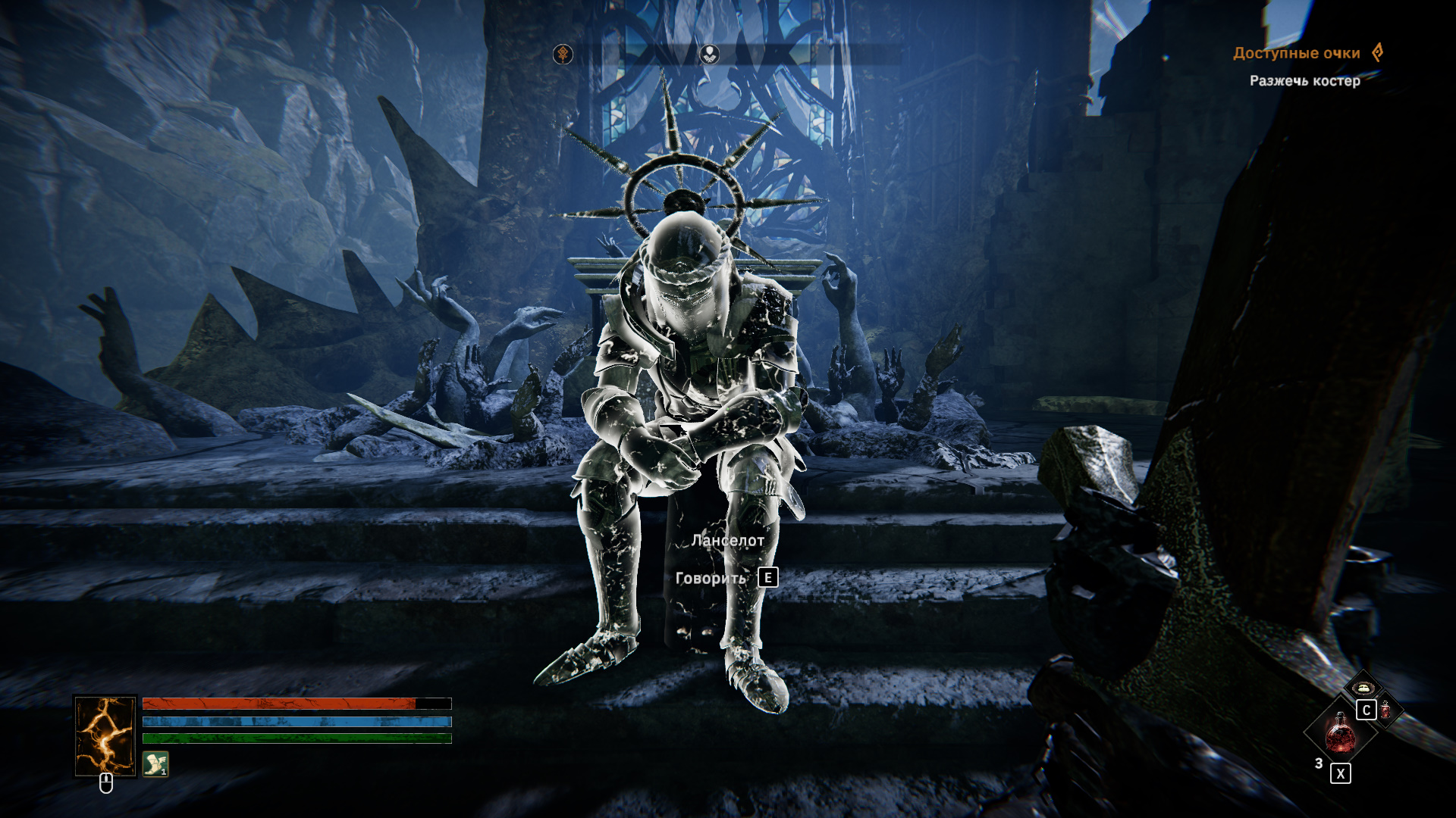 Прежде всего, вы должны понимать, что это опасное место! Убейте оруженосцев и поговорите с Ланселотом, а после взаимодействуйте с гробницей позади него.